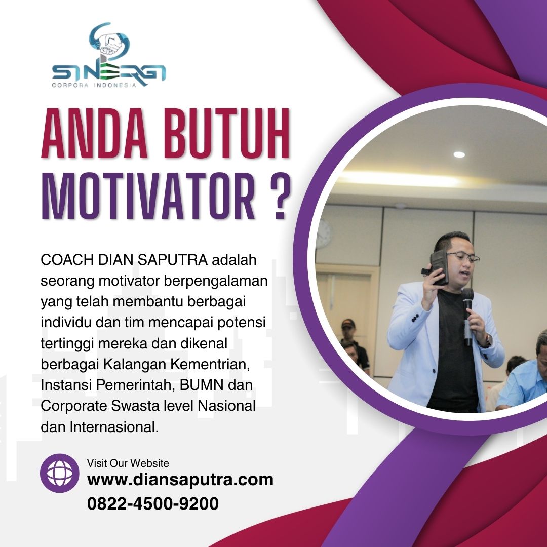 Anda Berada di Info Yang Tepat. Dian Saputra adalah seorang Motivator sekaligus Trainer sinergi corpora Indonesia yang sudah berpengalaman selama 13 Tahun. Coach Dian Saputra selalu memberikan materi yang fun dan Berdampak guna meningkatkan kinerja dan produktivitas SDM di Bisnis Anda. Coach Dian Saputra dikenal oleh Kalangan Corporate Seperti BUMN, Dinas Pemerintah, Kementerian, Hingga Corporate Swasta Lainnya berskala Nasional dan Internasional.