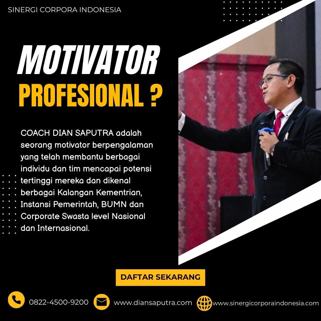 Anda Berada di Info Yang Tepat. Dian Saputra adalah seorang Motivator sekaligus Trainer sinergi corpora Indonesia yang sudah berpengalaman selama 13 Tahun. Coach Dian Saputra selalu memberikan materi yang fun dan Berdampak guna meningkatkan kinerja dan produktivitas SDM di Bisnis Anda. Coach Dian Saputra dikenal oleh Kalangan Corporate Seperti BUMN, Dinas Pemerintah, Kementerian, Hingga Corporate Swasta Lainnya berskala Nasional dan Internasional.