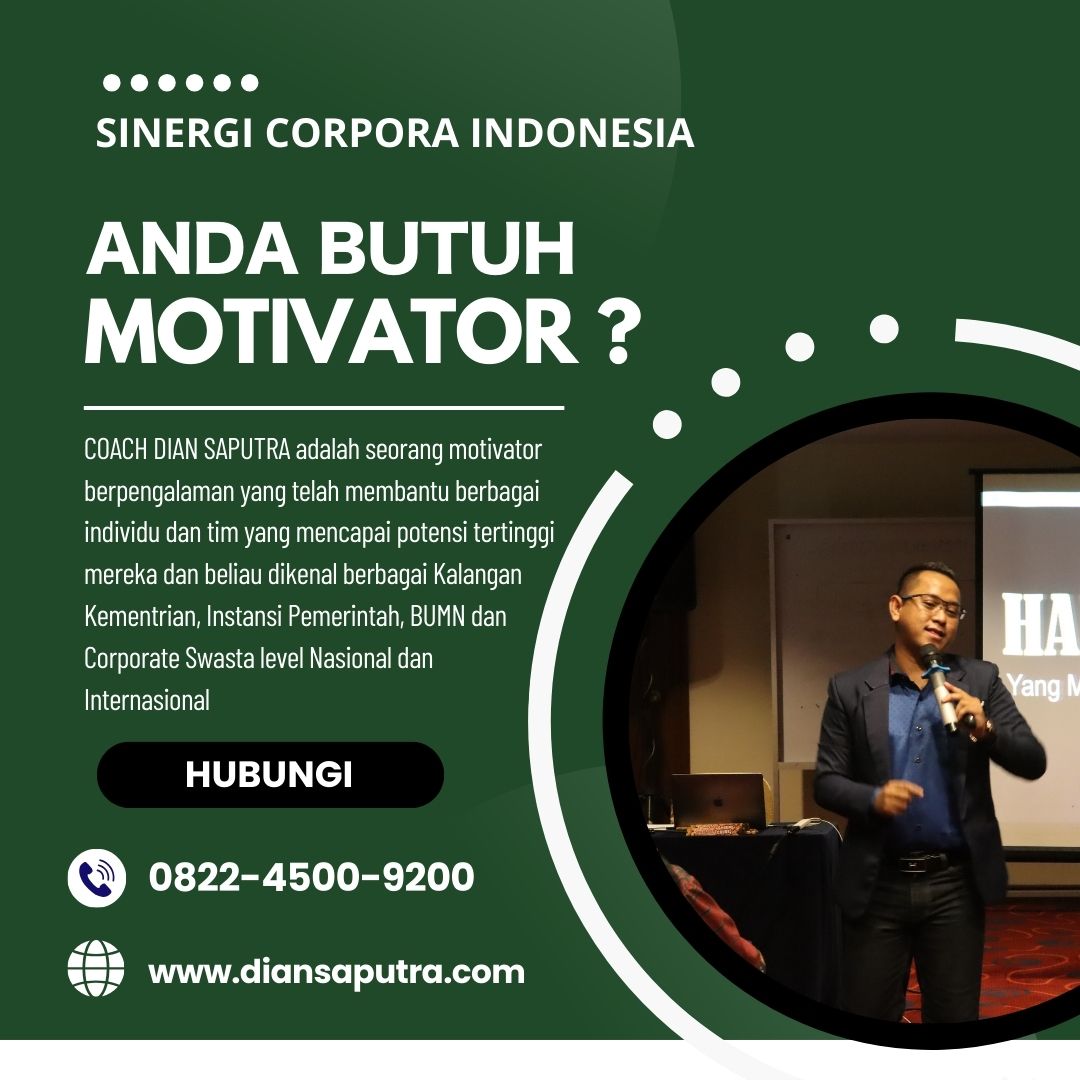Anda Berada di Info Yang Tepat. Dian Saputra adalah seorang Motivator sekaligus Trainer sinergi corpora Indonesia yang sudah berpengalaman selama 13 Tahun. Coach Dian Saputra selalu memberikan materi yang fun dan Berdampak guna meningkatkan kinerja dan produktivitas SDM di Bisnis Anda. Coach Dian Saputra dikenal oleh Kalangan Corporate Seperti BUMN, Dinas Pemerintah, Kementerian, Hingga Corporate Swasta Lainnya berskala Nasional dan Internasional.