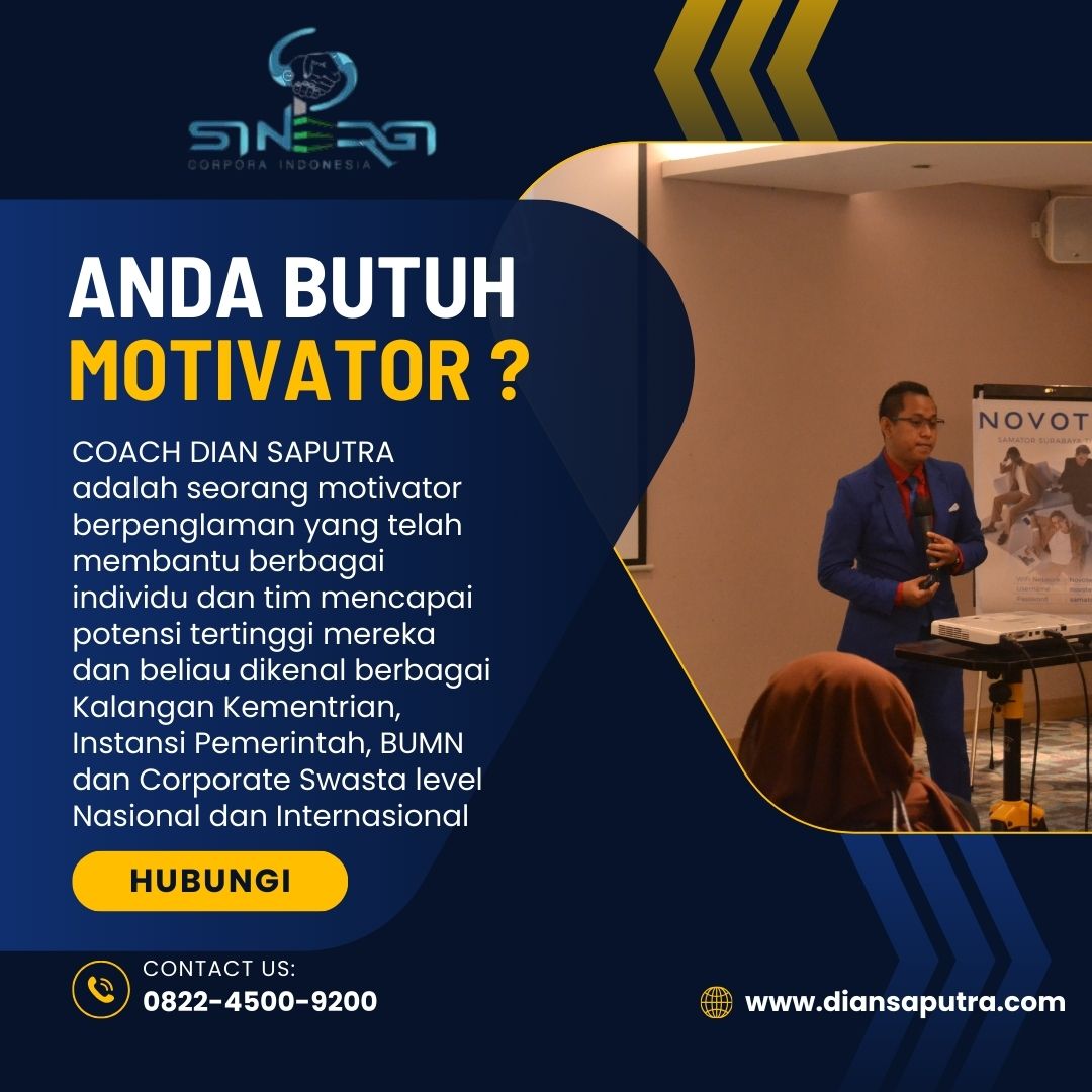 Anda Berada di Info Yang Tepat. Dian Saputra adalah seorang Motivator sekaligus Trainer sinergi corpora Indonesia yang sudah berpengalaman selama 13 Tahun. Coach Dian Saputra selalu memberikan materi yang fun dan Berdampak guna meningkatkan kinerja dan produktivitas SDM di Bisnis Anda. Coach Dian Saputra dikenal oleh Kalangan Corporate Seperti BUMN, Dinas Pemerintah, Kementerian, Hingga Corporate Swasta Lainnya berskala Nasional dan Internasional.