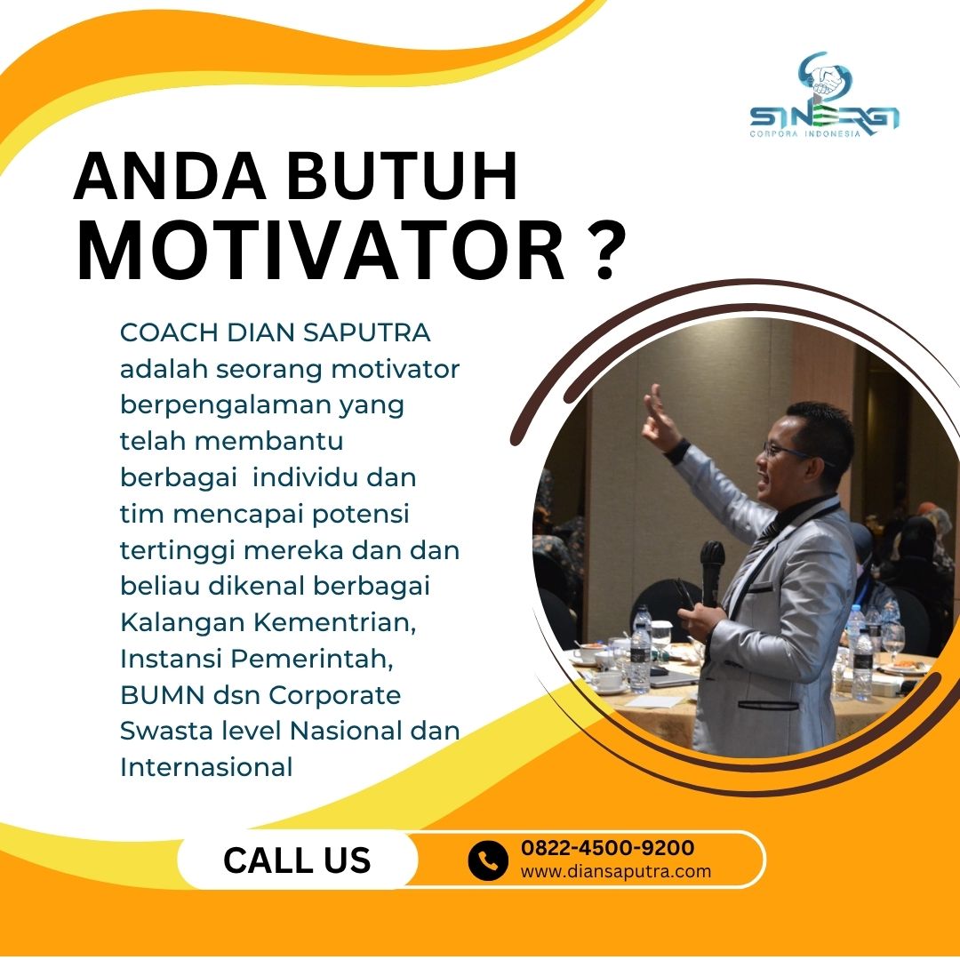 Anda Berada di Info Yang Tepat. Dian Saputra adalah seorang Motivator sekaligus Trainer sinergi corpora Indonesia yang sudah berpengalaman selama 13 Tahun. Coach Dian Saputra selalu memberikan materi yang fun dan Berdampak guna meningkatkan kinerja dan produktivitas SDM di Bisnis Anda. Coach Dian Saputra dikenal oleh Kalangan Corporate Seperti BUMN, Dinas Pemerintah, Kementerian, Hingga Corporate Swasta Lainnya berskala Nasional dan Internasional.