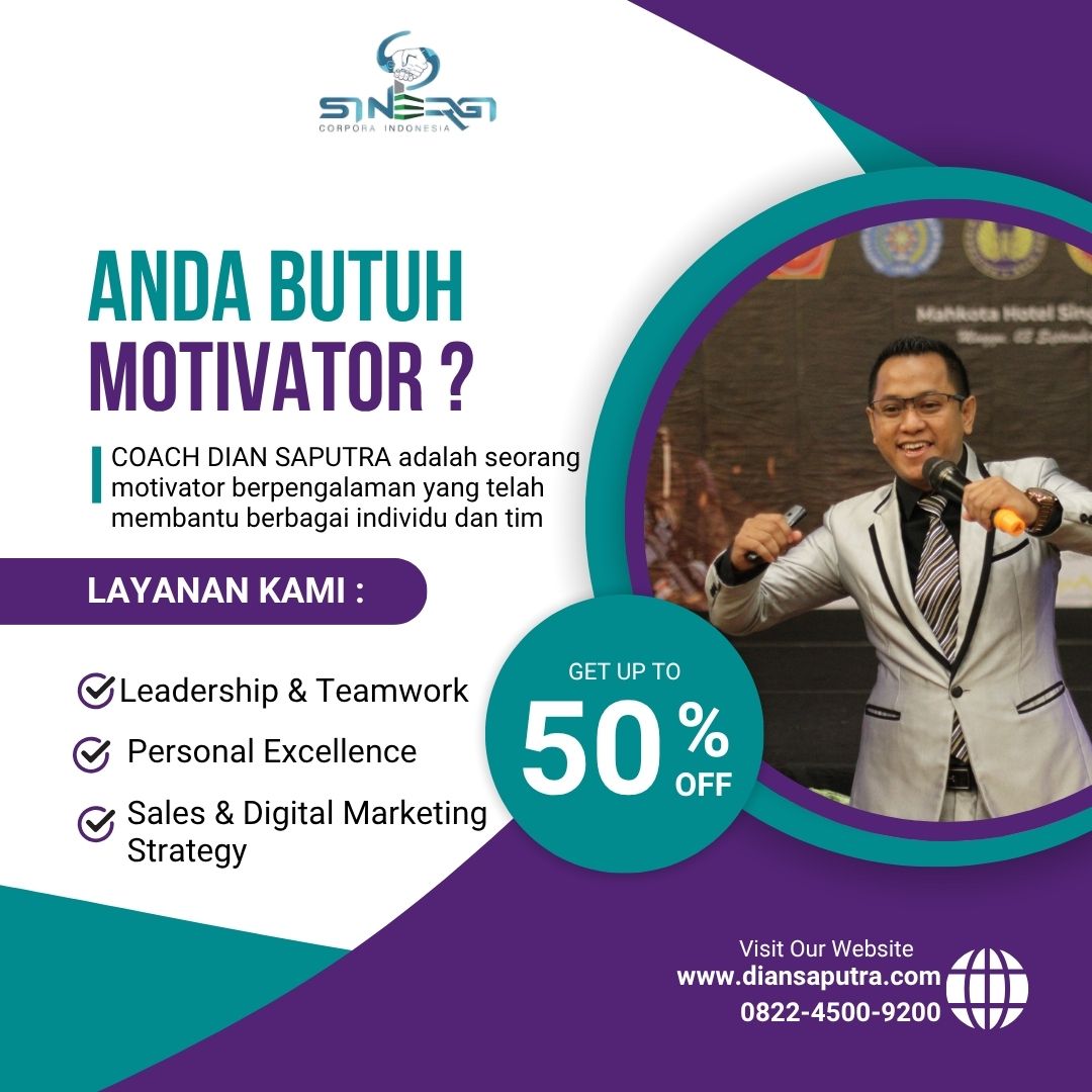 Anda Berada di Info Yang Tepat. Dian Saputra adalah seorang Motivator sekaligus Trainer sinergi corpora Indonesia yang sudah berpengalaman selama 13 Tahun. Coach Dian Saputra selalu memberikan materi yang fun dan Berdampak guna meningkatkan kinerja dan produktivitas SDM di Bisnis Anda. Coach Dian Saputra dikenal oleh Kalangan Corporate Seperti BUMN, Dinas Pemerintah, Kementerian, Hingga Corporate Swasta Lainnya berskala Nasional dan Internasional.