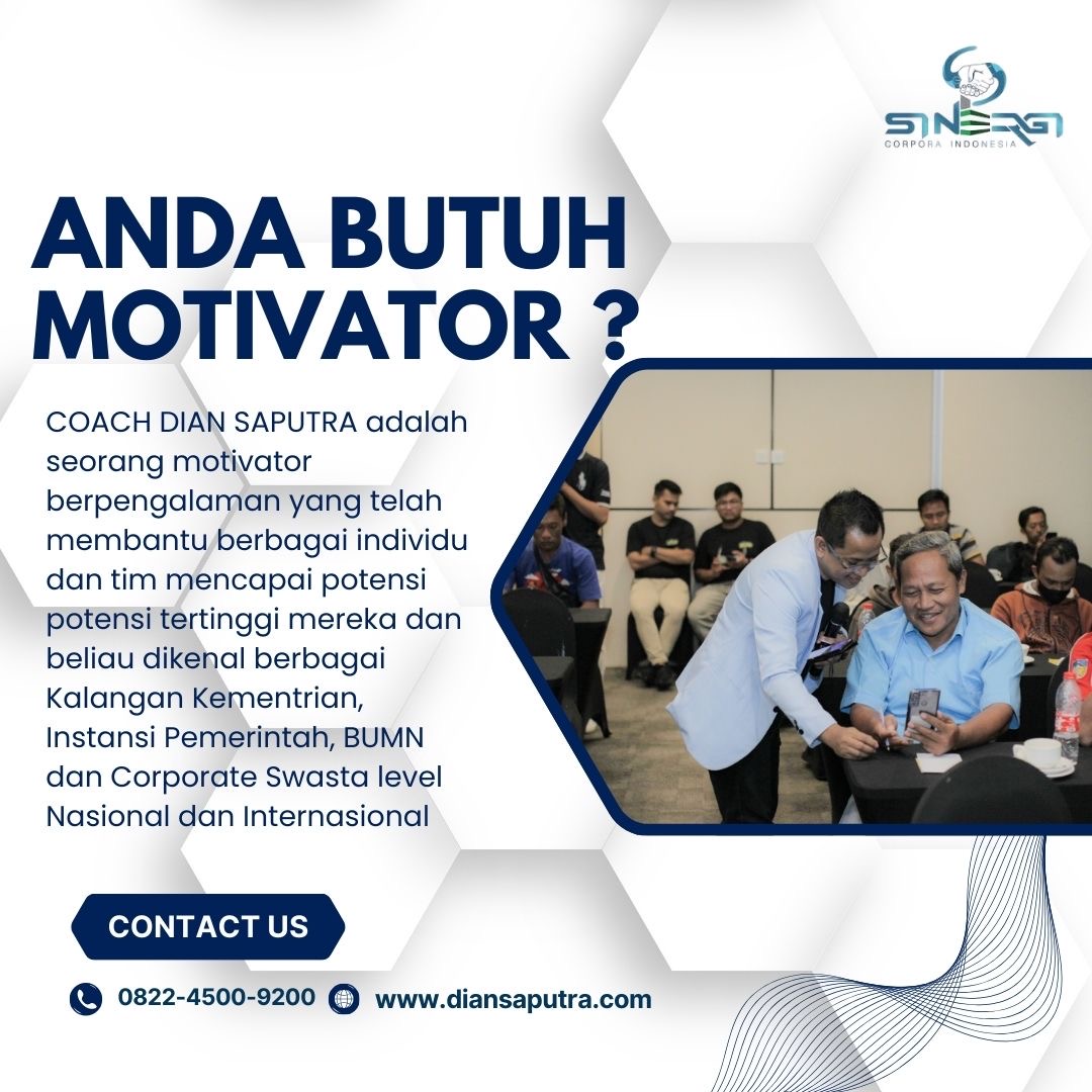 Anda Berada di Info Yang Tepat. Dian Saputra adalah seorang Motivator sekaligus Trainer sinergi corpora Indonesia yang sudah berpengalaman selama 13 Tahun. Coach Dian Saputra selalu memberikan materi yang fun dan Berdampak guna meningkatkan kinerja dan produktivitas SDM di Bisnis Anda. Coach Dian Saputra dikenal oleh Kalangan Corporate Seperti BUMN, Dinas Pemerintah, Kementerian, Hingga Corporate Swasta Lainnya berskala Nasional dan Internasional.