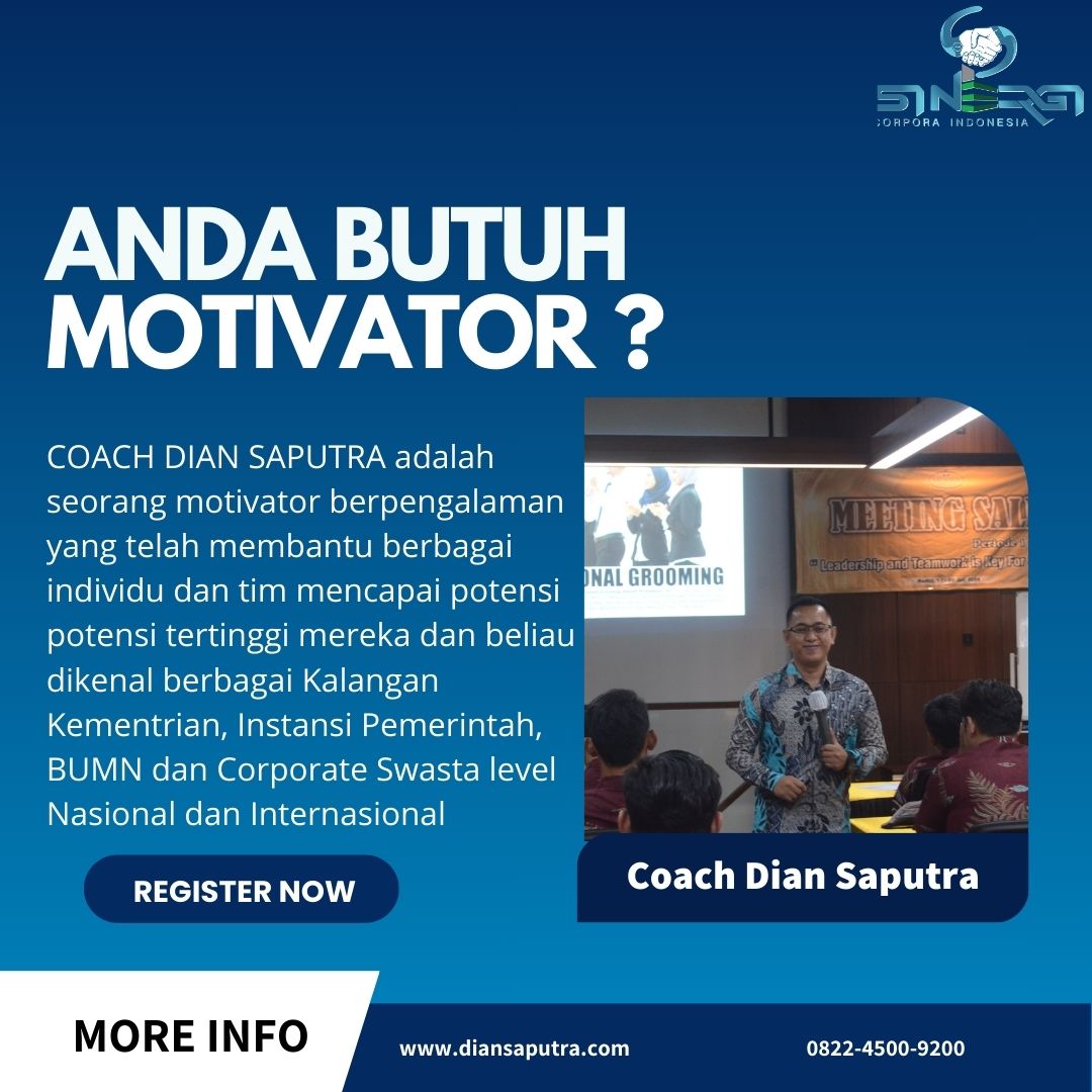 Anda Berada di Info Yang Tepat. Dian Saputra adalah seorang Motivator sekaligus Trainer sinergi corpora Indonesia yang sudah berpengalaman selama 13 Tahun. Coach Dian Saputra selalu memberikan materi yang fun dan Berdampak guna meningkatkan kinerja dan produktivitas SDM di Bisnis Anda. Coach Dian Saputra dikenal oleh Kalangan Corporate Seperti BUMN, Dinas Pemerintah, Kementerian, Hingga Corporate Swasta Lainnya berskala Nasional dan Internasional.