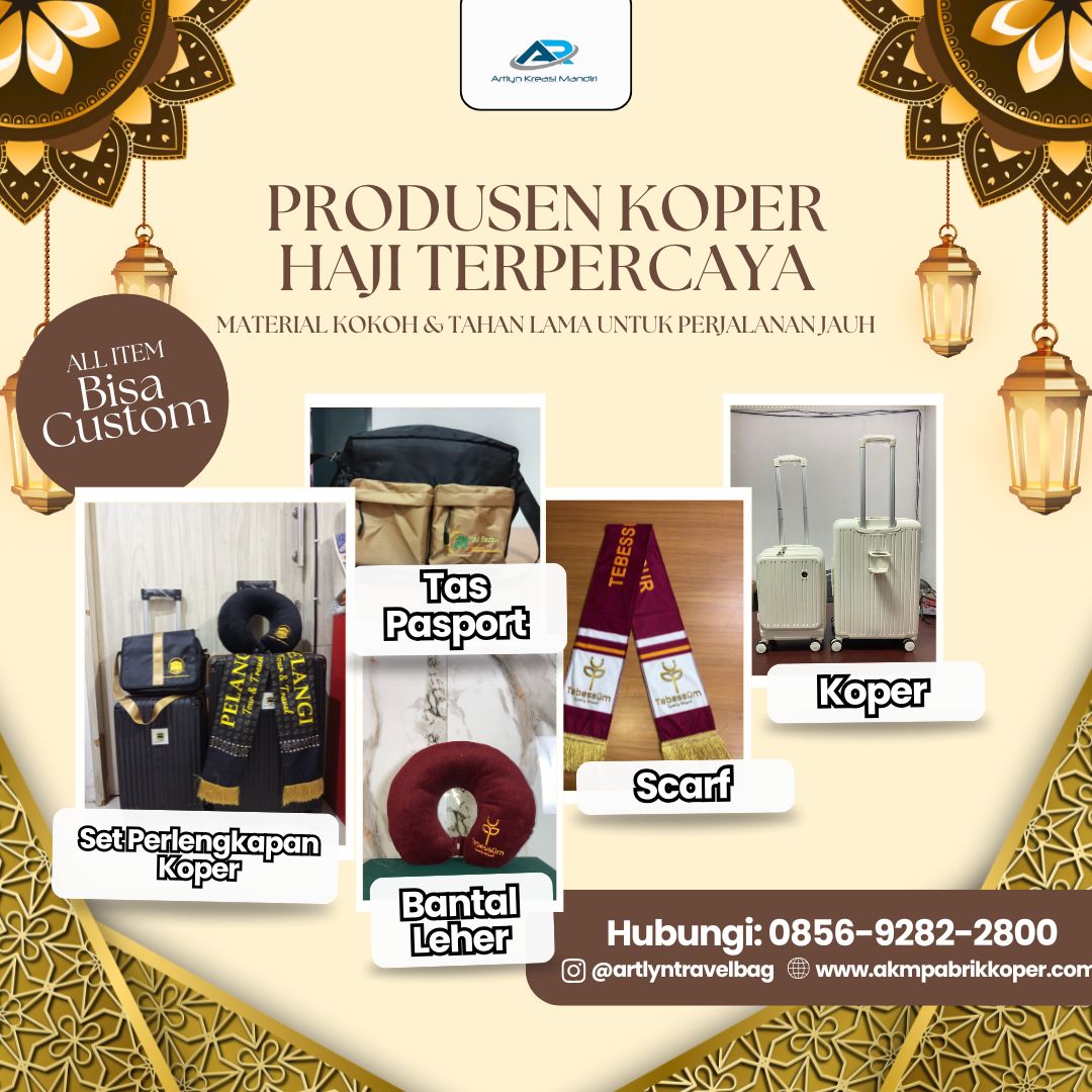 "KLIK: https://wa.me/6285692822800, PT. Artlyn Kreasi Mandiri (AKM) adalah produsen koper haji dan umroh yang dikenal menghadirkan koper premium, berkualitas tinggi, dan bisa custom logo. Semua produk diproduksi langsung di pabrik sehingga terjamin kualitasnya sekaligus lebih hemat karena harga grosir.
