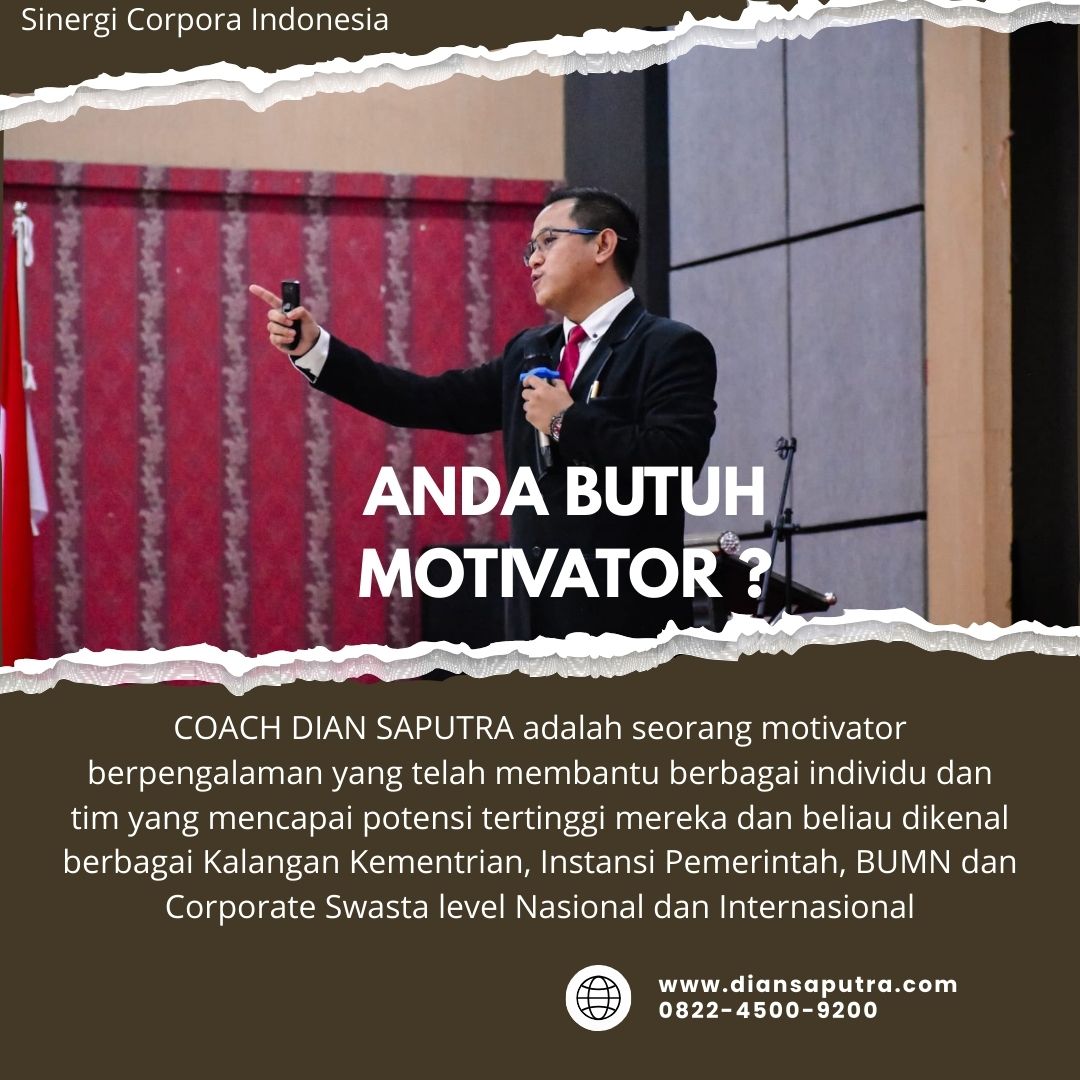 Anda Berada di Info Yang Tepat. Dian Saputra adalah seorang Motivator sekaligus Trainer sinergi corpora Indonesia yang sudah berpengalaman selama 13 Tahun. Coach Dian Saputra selalu memberikan materi yang fun dan Berdampak guna meningkatkan kinerja dan produktivitas SDM di Bisnis Anda. Coach Dian Saputra dikenal oleh Kalangan Corporate Seperti BUMN, Dinas Pemerintah, Kementerian, Hingga Corporate Swasta Lainnya berskala Nasional dan Internasional.