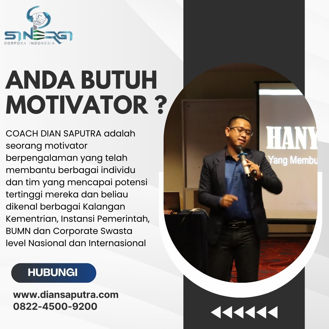 Anda Berada di Info Yang Tepat. Dian Saputra adalah seorang Motivator sekaligus Trainer sinergi corpora Indonesia yang sudah berpengalaman selama 13 Tahun. Coach Dian Saputra selalu memberikan materi yang fun dan Berdampak guna meningkatkan kinerja dan produktivitas SDM di Bisnis Anda. Coach Dian Saputra dikenal oleh Kalangan Corporate Seperti BUMN, Dinas Pemerintah, Kementerian, Hingga Corporate Swasta Lainnya berskala Nasional dan Internasional.