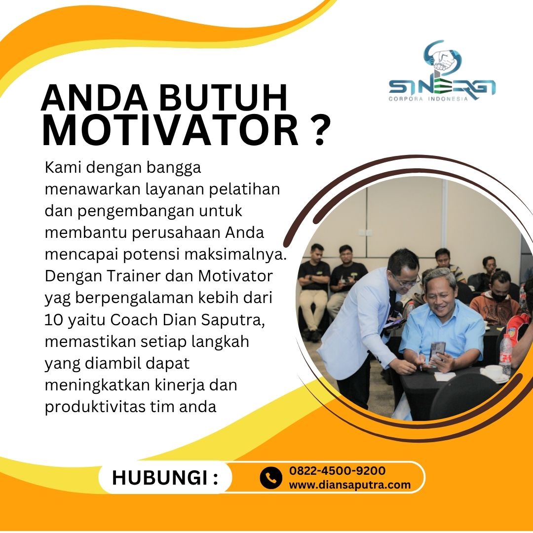 Anda Berada di Info Yang Tepat. Dian Saputra adalah seorang Motivator sekaligus Trainer sinergi corpora Indonesia yang sudah berpengalaman selama 13 Tahun. Coach Dian Saputra selalu memberikan materi yang fun dan Berdampak guna meningkatkan kinerja dan produktivitas SDM di Bisnis Anda. Coach Dian Saputra dikenal oleh Kalangan Corporate Seperti BUMN, Dinas Pemerintah, Kementerian, Hingga Corporate Swasta Lainnya berskala Nasional dan Internasional.