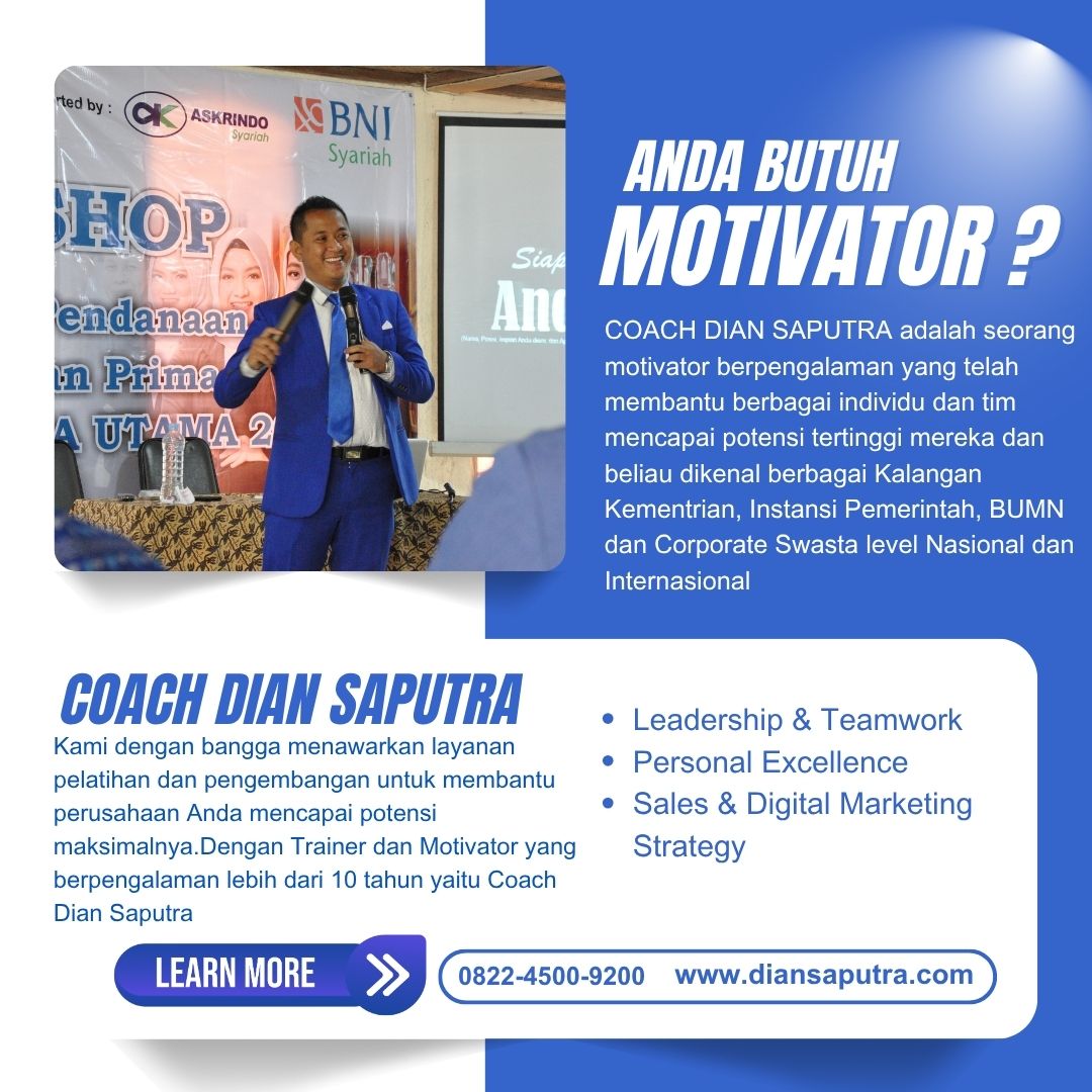 Anda Berada di Info Yang Tepat. Dian Saputra adalah seorang Motivator sekaligus Trainer sinergi corpora Indonesia yang sudah berpengalaman selama 13 Tahun. Coach Dian Saputra selalu memberikan materi yang fun dan Berdampak guna meningkatkan kinerja dan produktivitas SDM di Bisnis Anda. Coach Dian Saputra dikenal oleh Kalangan Corporate Seperti BUMN, Dinas Pemerintah, Kementerian, Hingga Corporate Swasta Lainnya berskala Nasional dan Internasional.