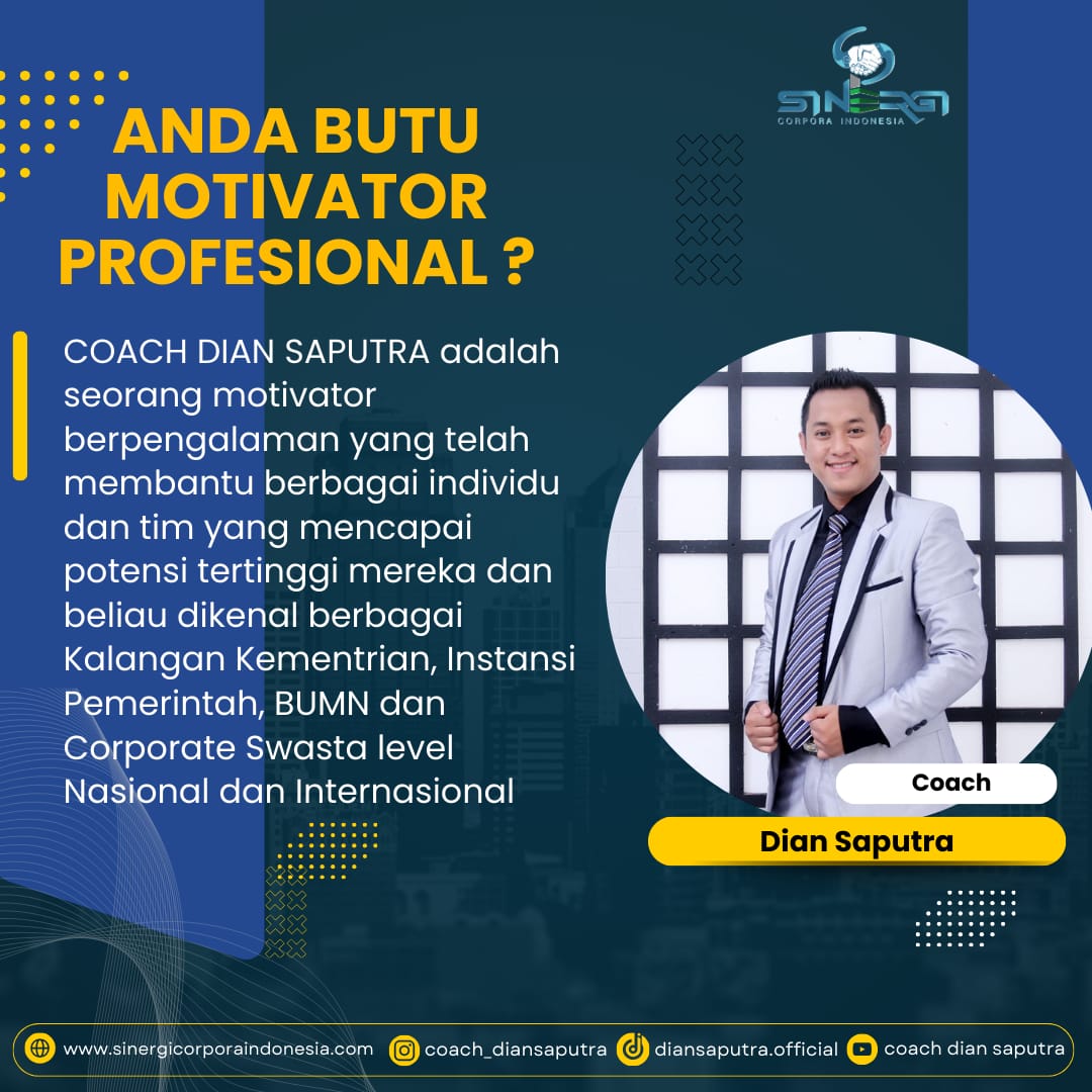 Anda Berada di Info Yang Tepat. Dian Saputra adalah seorang Motivator sekaligus Trainer sinergi corpora Indonesia yang sudah berpengalaman selama 13 Tahun. Coach Dian Saputra selalu memberikan materi yang fun dan Berdampak guna meningkatkan kinerja dan produktivitas SDM di Bisnis Anda. Coach Dian Saputra dikenal oleh Kalangan Corporate Seperti BUMN, Dinas Pemerintah, Kementerian, Hingga Corporate Swasta Lainnya berskala Nasional dan Internasional.