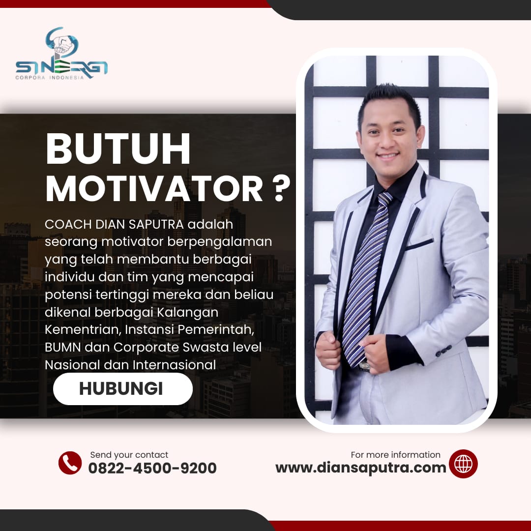 Anda Berada di Info Yang Tepat. Dian Saputra adalah seorang Motivator sekaligus Trainer sinergi corpora Indonesia yang sudah berpengalaman selama 13 Tahun. Coach Dian Saputra selalu memberikan materi yang fun dan Berdampak guna meningkatkan kinerja dan produktivitas SDM di Bisnis Anda. Coach Dian Saputra dikenal oleh Kalangan Corporate Seperti BUMN, Dinas Pemerintah, Kementerian, Hingga Corporate Swasta Lainnya berskala Nasional dan Internasional.