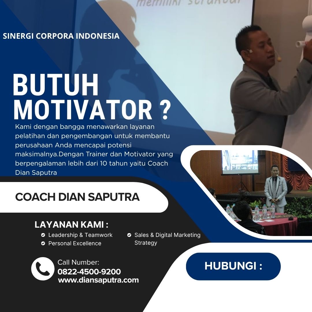 Anda Berada di Info Yang Tepat. Dian Saputra adalah seorang Motivator sekaligus Trainer sinergi corpora Indonesia yang sudah berpengalaman selama 13 Tahun. Coach Dian Saputra selalu memberikan materi yang fun dan Berdampak guna meningkatkan kinerja dan produktivitas SDM di Bisnis Anda. Coach Dian Saputra dikenal oleh Kalangan Corporate Seperti BUMN, Dinas Pemerintah, Kementerian, Hingga Corporate Swasta Lainnya berskala Nasional dan Internasional.
