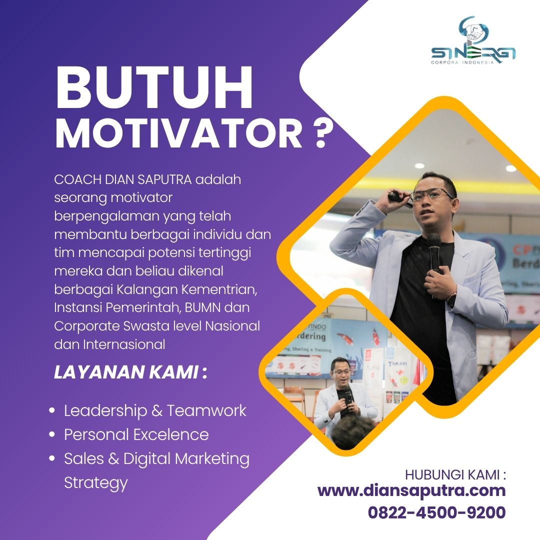 Anda Berada di Info Yang Tepat. Dian Saputra adalah seorang Motivator sekaligus Trainer sinergi corpora Indonesia yang sudah berpengalaman selama 13 Tahun. Coach Dian Saputra selalu memberikan materi yang fun dan Berdampak guna meningkatkan kinerja dan produktivitas SDM di Bisnis Anda. Coach Dian Saputra dikenal oleh Kalangan Corporate Seperti BUMN, Dinas Pemerintah, Kementerian, Hingga Corporate Swasta Lainnya berskala Nasional dan Internasional.