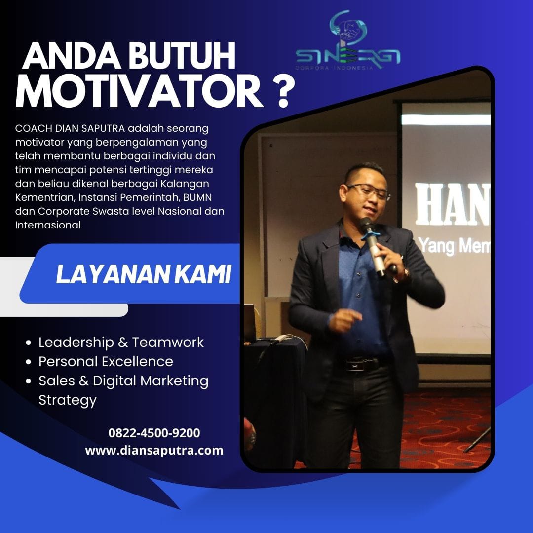 Anda Berada di Info Yang Tepat. Dian Saputra adalah seorang Motivator sekaligus Trainer sinergi corpora Indonesia yang sudah berpengalaman selama 13 Tahun. Coach Dian Saputra selalu memberikan materi yang fun dan Berdampak guna meningkatkan kinerja dan produktivitas SDM di Bisnis Anda. Coach Dian Saputra dikenal oleh Kalangan Corporate Seperti BUMN, Dinas Pemerintah, Kementerian, Hingga Corporate Swasta Lainnya berskala Nasional dan Internasional.