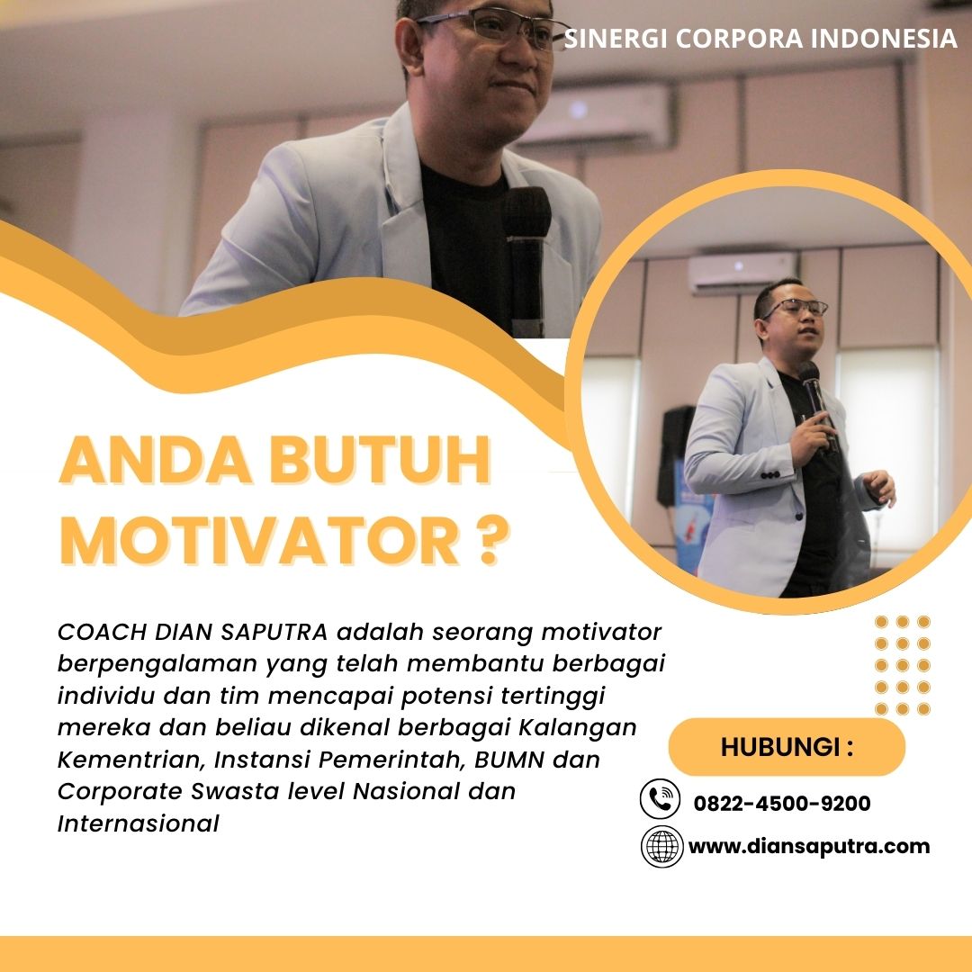 Anda Berada di Info Yang Tepat. Dian Saputra adalah seorang Motivator sekaligus Trainer sinergi corpora Indonesia yang sudah berpengalaman selama 13 Tahun. Coach Dian Saputra selalu memberikan materi yang fun dan Berdampak guna meningkatkan kinerja dan produktivitas SDM di Bisnis Anda. Coach Dian Saputra dikenal oleh Kalangan Corporate Seperti BUMN, Dinas Pemerintah, Kementerian, Hingga Corporate Swasta Lainnya berskala Nasional dan Internasional.