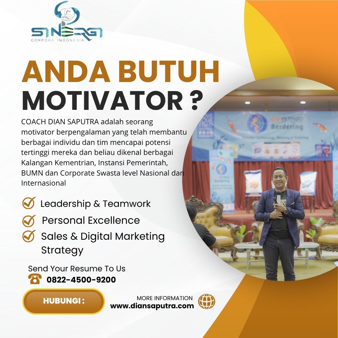 Anda Berada di Info Yang Tepat. Dian Saputra adalah seorang Motivator sekaligus Trainer sinergi corpora Indonesia yang sudah berpengalaman selama 13 Tahun. Coach Dian Saputra selalu memberikan materi yang fun dan Berdampak guna meningkatkan kinerja dan produktivitas SDM di Bisnis Anda. Coach Dian Saputra dikenal oleh Kalangan Corporate Seperti BUMN, Dinas Pemerintah, Kementerian, Hingga Corporate Swasta Lainnya berskala Nasional dan Internasional.