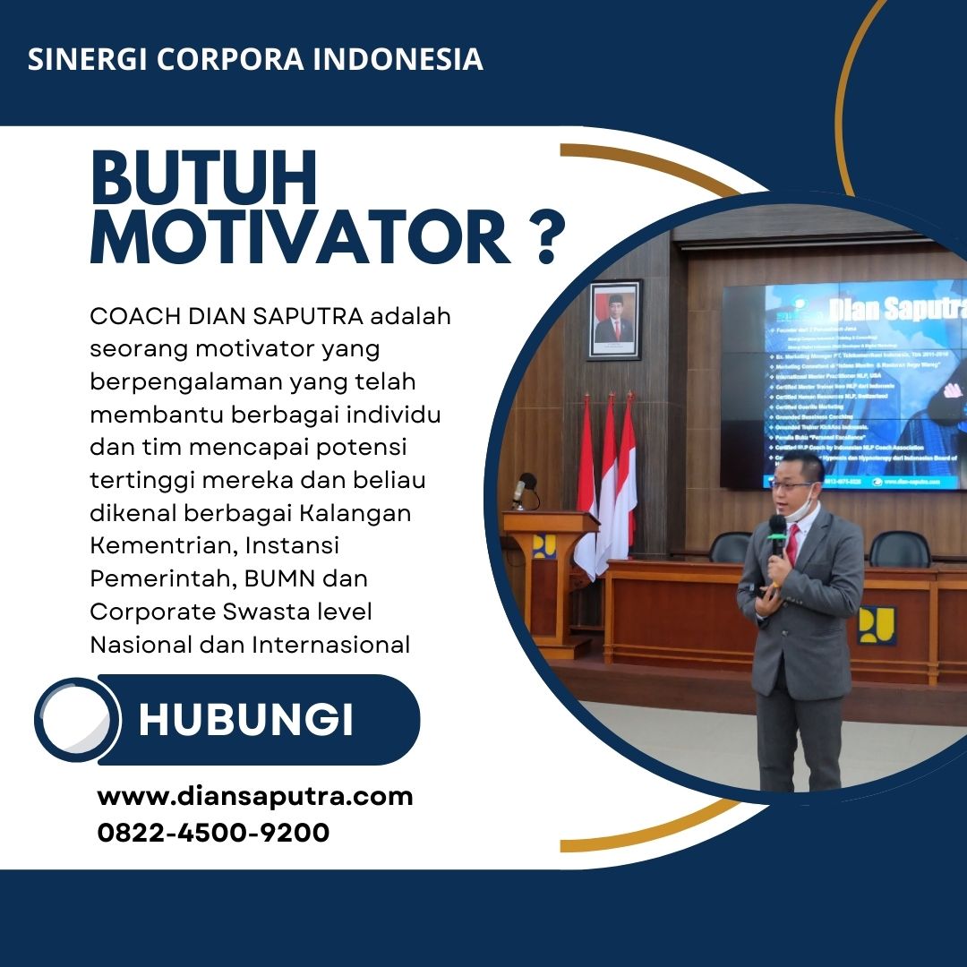 Anda Berada di Info Yang Tepat. Dian Saputra adalah seorang Motivator sekaligus Trainer sinergi corpora Indonesia yang sudah berpengalaman selama 13 Tahun. Coach Dian Saputra selalu memberikan materi yang fun dan Berdampak guna meningkatkan kinerja dan produktivitas SDM di Bisnis Anda. Coach Dian Saputra dikenal oleh Kalangan Corporate Seperti BUMN, Dinas Pemerintah, Kementerian, Hingga Corporate Swasta Lainnya berskala Nasional dan Internasional.