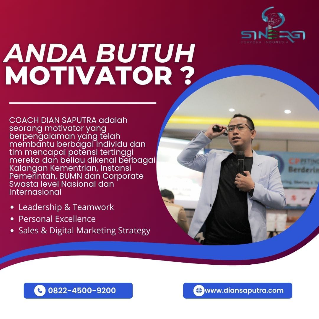 Anda Berada di Info Yang Tepat. Dian Saputra adalah seorang Motivator sekaligus Trainer sinergi corpora Indonesia yang sudah berpengalaman selama 13 Tahun. Coach Dian Saputra selalu memberikan materi yang fun dan Berdampak guna meningkatkan kinerja dan produktivitas SDM di Bisnis Anda. Coach Dian Saputra dikenal oleh Kalangan Corporate Seperti BUMN, Dinas Pemerintah, Kementerian, Hingga Corporate Swasta Lainnya berskala Nasional dan Internasional.