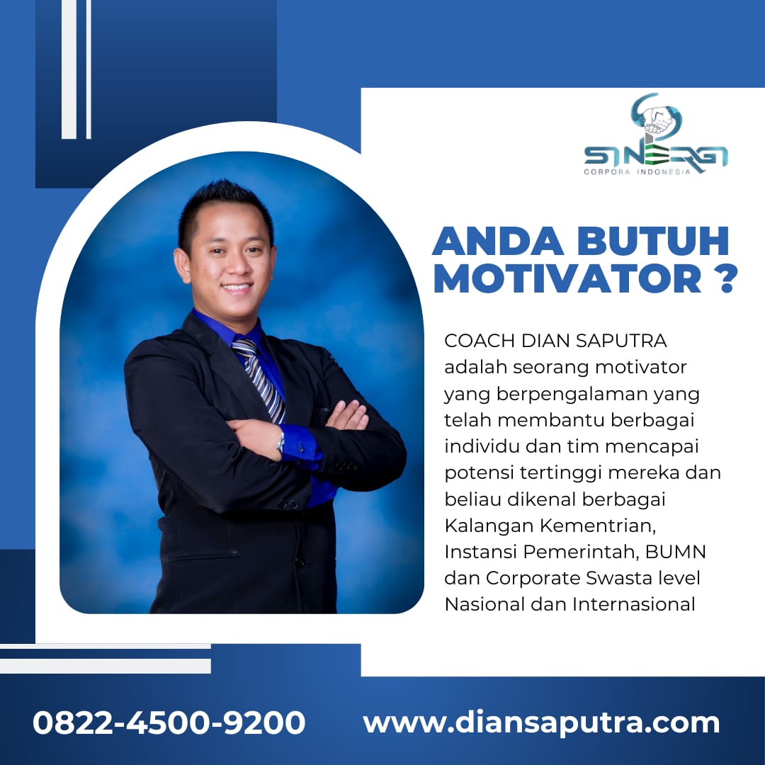 Anda Berada di Info Yang Tepat. Dian Saputra adalah seorang Motivator sekaligus Trainer sinergi corpora Indonesia yang sudah berpengalaman selama 13 Tahun. Coach Dian Saputra selalu memberikan materi yang fun dan Berdampak guna meningkatkan kinerja dan produktivitas SDM di Bisnis Anda. Coach Dian Saputra dikenal oleh Kalangan Corporate Seperti BUMN, Dinas Pemerintah, Kementerian, Hingga Corporate Swasta Lainnya berskala Nasional dan Internasional.