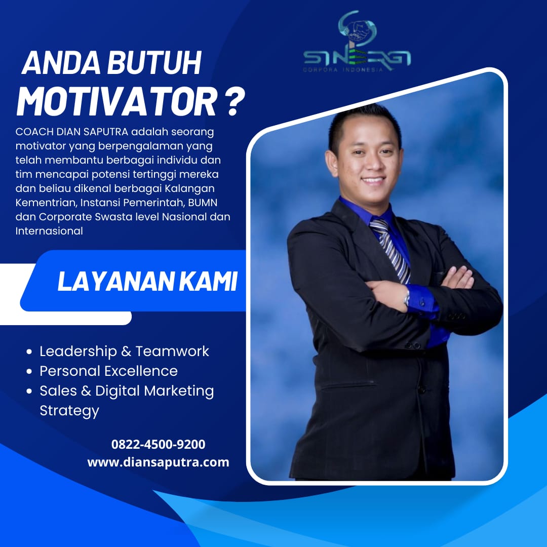 Anda Berada di Info Yang Tepat. Dian Saputra adalah seorang Motivator sekaligus Trainer sinergi corpora Indonesia yang sudah berpengalaman selama 13 Tahun. Coach Dian Saputra selalu memberikan materi yang fun dan Berdampak guna meningkatkan kinerja dan produktivitas SDM di Bisnis Anda. Coach Dian Saputra dikenal oleh Kalangan Corporate Seperti BUMN, Dinas Pemerintah, Kementerian, Hingga Corporate Swasta Lainnya berskala Nasional dan Internasional.