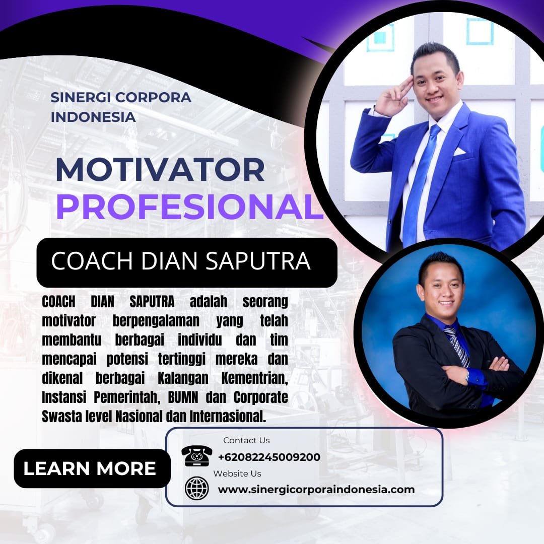 Anda Berada di Info Yang Tepat. Dian Saputra adalah seorang Motivator sekaligus Trainer sinergi corpora Indonesia yang sudah berpengalaman selama 13 Tahun. Coach Dian Saputra selalu memberikan materi yang fun dan Berdampak guna meningkatkan kinerja dan produktivitas SDM di Bisnis Anda. Coach Dian Saputra dikenal oleh Kalangan Corporate Seperti BUMN, Dinas Pemerintah, Kementerian, Hingga Corporate Swasta Lainnya berskala Nasional dan Internasional.