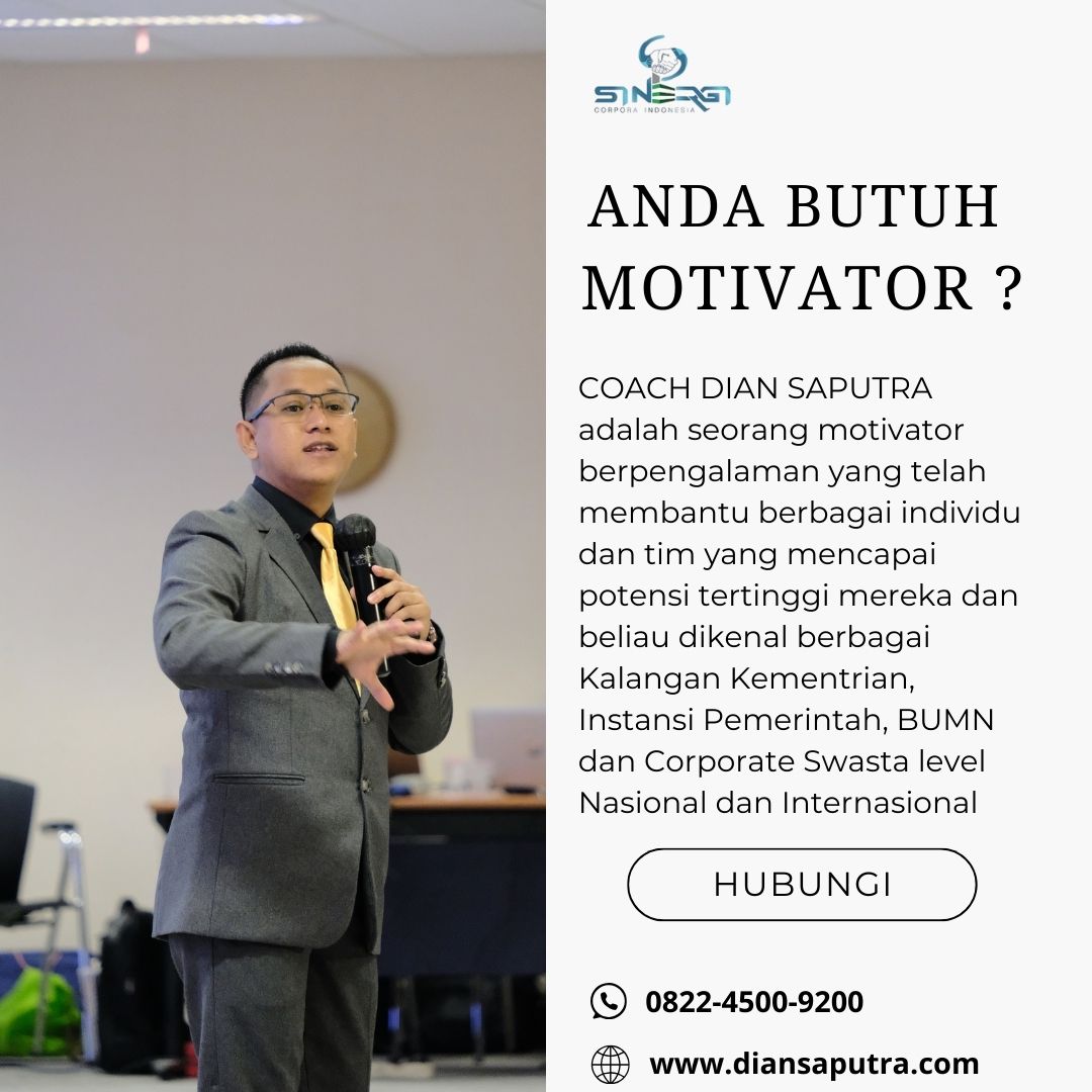 Anda Berada di Info Yang Tepat. Dian Saputra adalah seorang Motivator sekaligus Trainer sinergi corpora Indonesia yang sudah berpengalaman selama 13 Tahun. Coach Dian Saputra selalu memberikan materi yang fun dan Berdampak guna meningkatkan kinerja dan produktivitas SDM di Bisnis Anda. Coach Dian Saputra dikenal oleh Kalangan Corporate Seperti BUMN, Dinas Pemerintah, Kementerian, Hingga Corporate Swasta Lainnya berskala Nasional dan Internasional.