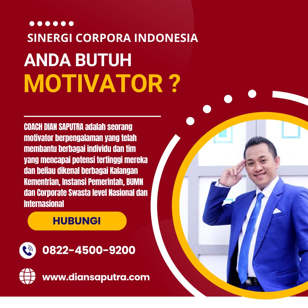 Anda Berada di Info Yang Tepat. Dian Saputra adalah seorang Motivator sekaligus Trainer sinergi corpora Indonesia yang sudah berpengalaman selama 13 Tahun. Coach Dian Saputra selalu memberikan materi yang fun dan Berdampak guna meningkatkan kinerja dan produktivitas SDM di Bisnis Anda. Coach Dian Saputra dikenal oleh Kalangan Corporate Seperti BUMN, Dinas Pemerintah, Kementerian, Hingga Corporate Swasta Lainnya berskala Nasional dan Internasional.