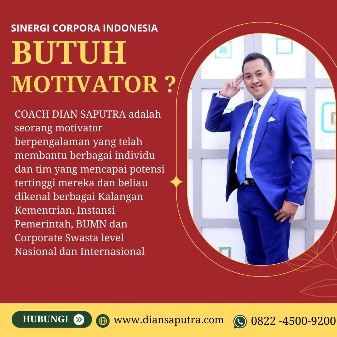 Anda Berada di Info Yang Tepat. Dian Saputra adalah seorang Motivator sekaligus Trainer sinergi corpora Indonesia yang sudah berpengalaman selama 13 Tahun. Coach Dian Saputra selalu memberikan materi yang fun dan Berdampak guna meningkatkan kinerja dan produktivitas SDM di Bisnis Anda. Coach Dian Saputra dikenal oleh Kalangan Corporate Seperti BUMN, Dinas Pemerintah, Kementerian, Hingga Corporate Swasta Lainnya berskala Nasional dan Internasional.