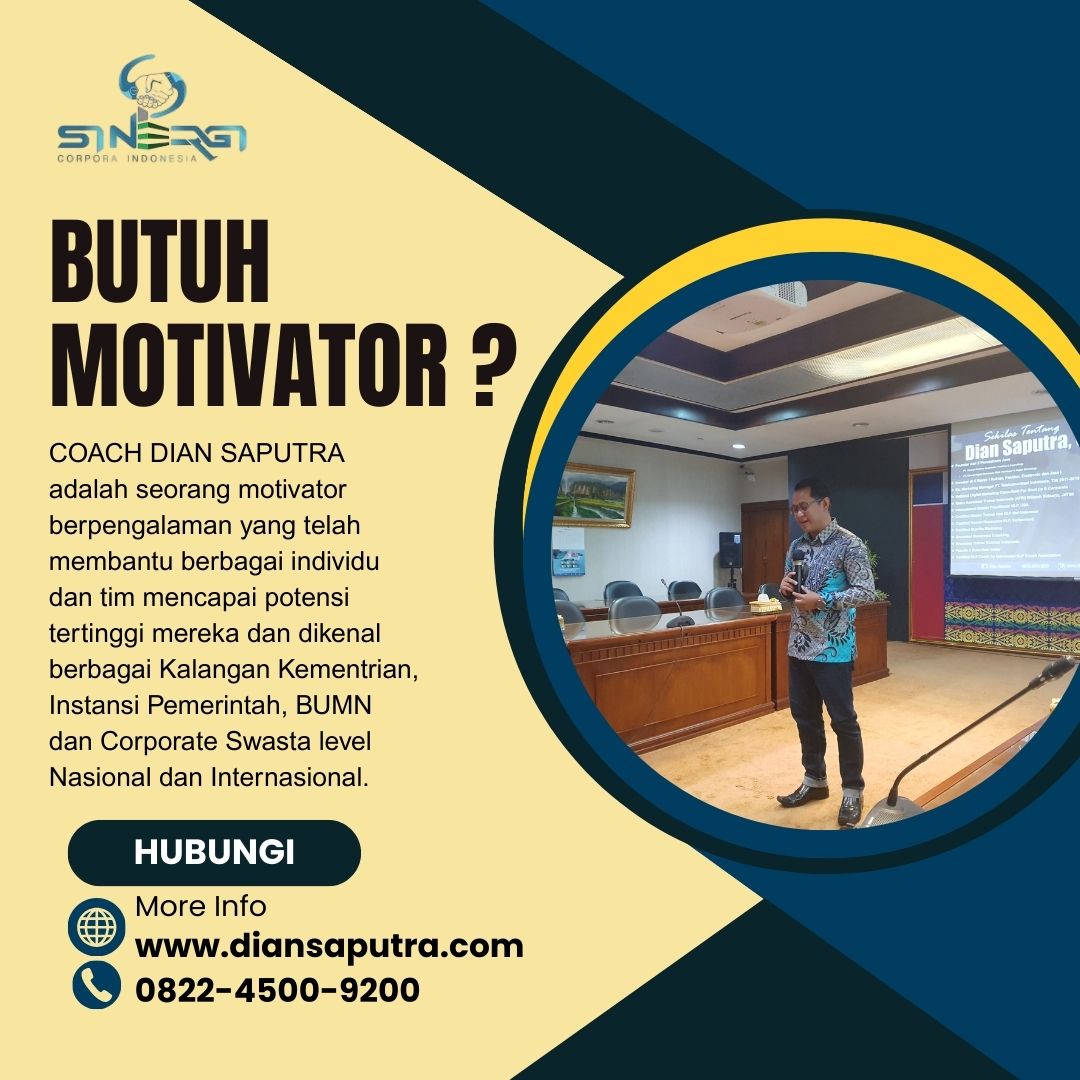 Anda Berada di Info Yang Tepat. Dian Saputra adalah seorang Motivator sekaligus Trainer sinergi corpora Indonesia yang sudah berpengalaman selama 13 Tahun. Coach Dian Saputra selalu memberikan materi yang fun dan Berdampak guna meningkatkan kinerja dan produktivitas SDM di Bisnis Anda. Coach Dian Saputra dikenal oleh Kalangan Corporate Seperti BUMN, Dinas Pemerintah, Kementerian, Hingga Corporate Swasta Lainnya berskala Nasional dan Internasional.