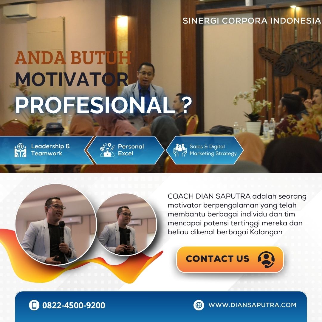 Sinergi Corpora Indonesia, di bawah pimpinan Coach Dian Saputra, sebagai Jasa Motivator Leadership Mojokerto lembaga pelatihan pengembangan SDM berbasis psikologi modern dan spiritual yang telah berpengalaman sejak tahun 2011. Dengan status sebagai motivator dan corporate trainer nasional serta latar praktik di BUMN dan sebagai penulis buku best-seller Coach Dian mengemas setiap sesi pelatihannya dengan nuansa yang unik: fun, atraktif, aplikatif, dan solutif.