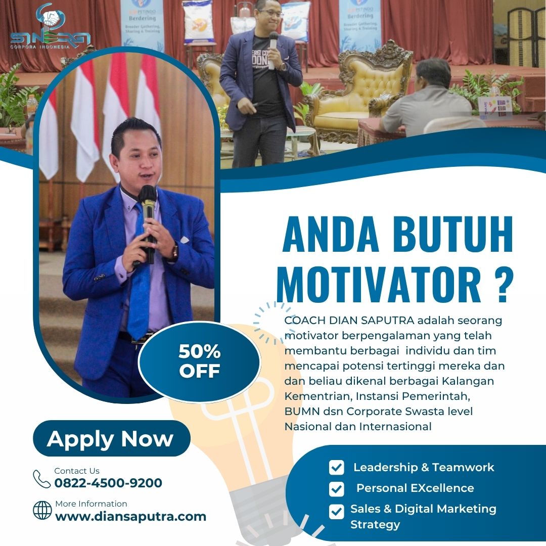 Anda Berada di Info Yang Tepat. Dian Saputra adalah seorang Motivator sekaligus Trainer sinergi corpora Indonesia yang sudah berpengalaman selama 13 Tahun. Coach Dian Saputra selalu memberikan materi yang fun dan Berdampak guna meningkatkan kinerja dan produktivitas SDM di Bisnis Anda. Coach Dian Saputra dikenal oleh Kalangan Corporate Seperti BUMN, Dinas Pemerintah, Kementerian, Hingga Corporate Swasta Lainnya berskala Nasional dan Internasional.
