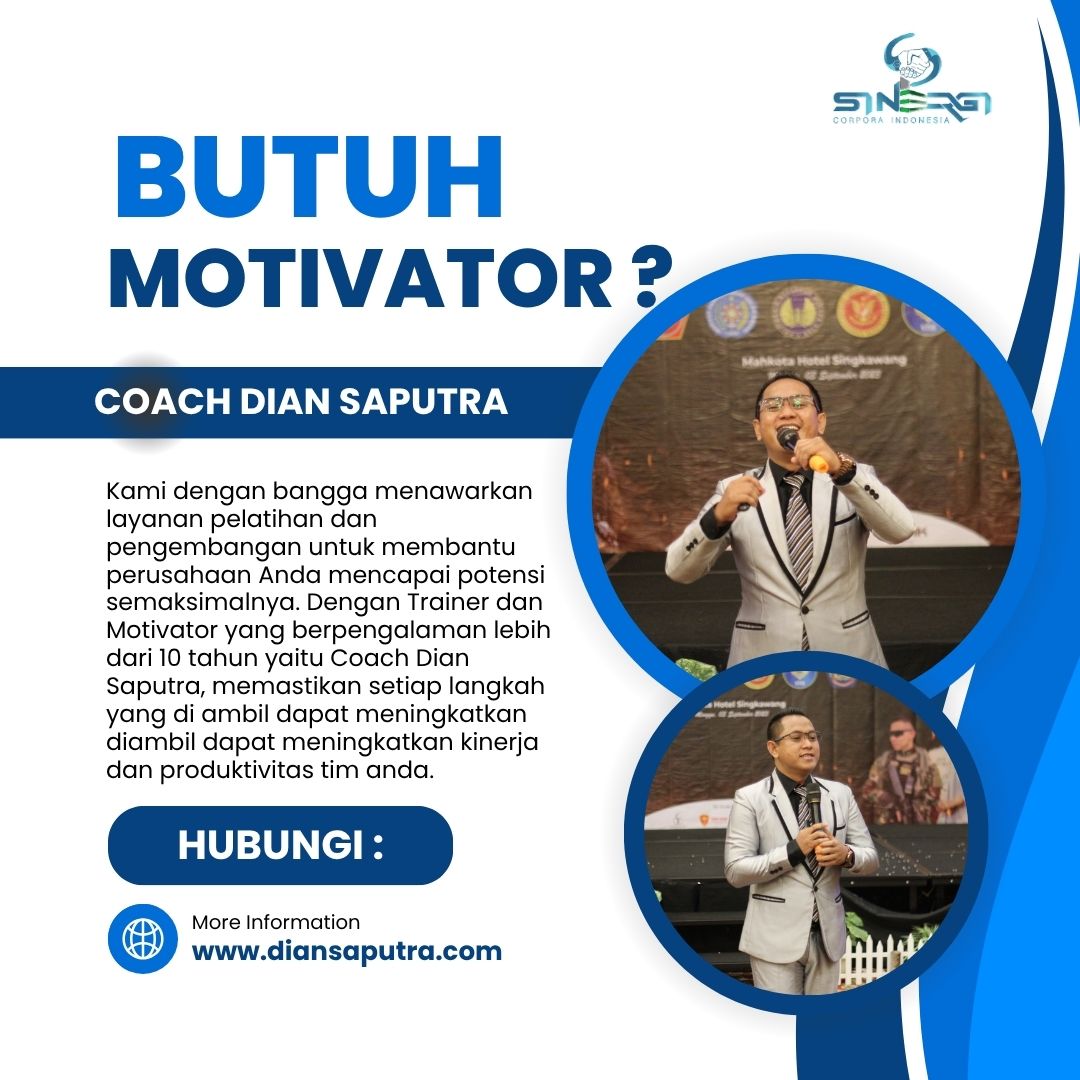 Anda Berada di Info Yang Tepat. Dian Saputra adalah seorang Motivator sekaligus Trainer sinergi corpora Indonesia yang sudah berpengalaman selama 13 Tahun. Coach Dian Saputra selalu memberikan materi yang fun dan Berdampak guna meningkatkan kinerja dan produktivitas SDM di Bisnis Anda. Coach Dian Saputra dikenal oleh Kalangan Corporate Seperti BUMN, Dinas Pemerintah, Kementerian, Hingga Corporate Swasta Lainnya berskala Nasional dan Internasional.