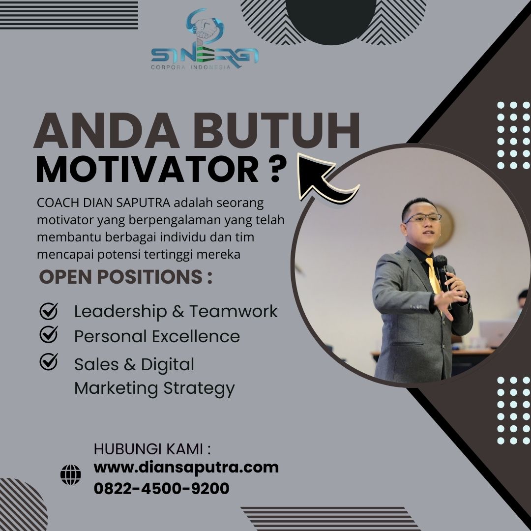 Anda Berada di Info Yang Tepat. Dian Saputra adalah seorang Motivator sekaligus Trainer sinergi corpora Indonesia yang sudah berpengalaman selama 13 Tahun. Coach Dian Saputra selalu memberikan materi yang fun dan Berdampak guna meningkatkan kinerja dan produktivitas SDM di Bisnis Anda. Coach Dian Saputra dikenal oleh Kalangan Corporate Seperti BUMN, Dinas Pemerintah, Kementerian, Hingga Corporate Swasta Lainnya berskala Nasional dan Internasional.