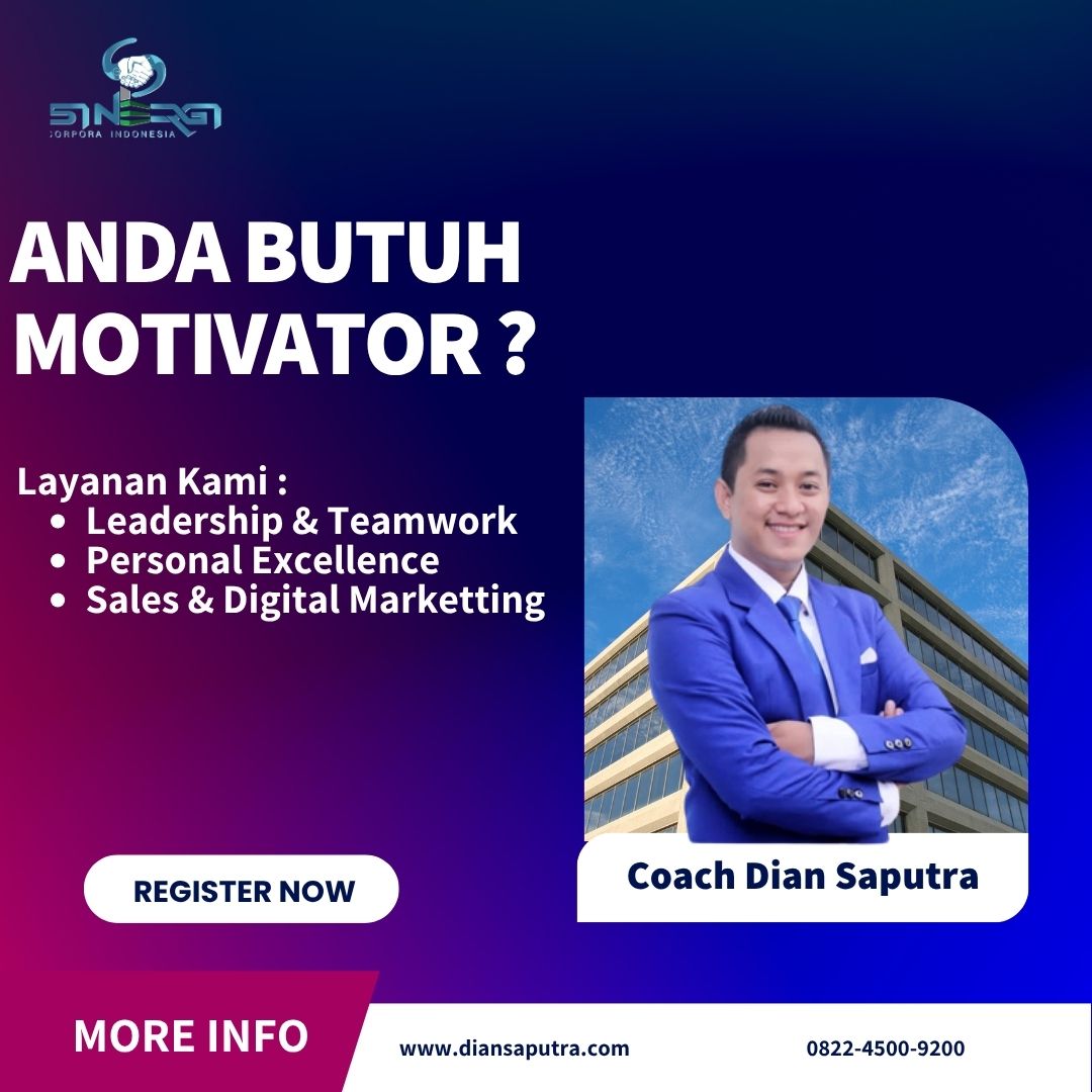Anda Berada di Info Yang Tepat. Dian Saputra adalah seorang Motivator sekaligus Trainer sinergi corpora Indonesia yang sudah berpengalaman selama 13 Tahun. Coach Dian Saputra selalu memberikan materi yang fun dan Berdampak guna meningkatkan kinerja dan produktivitas SDM di Bisnis Anda. Coach Dian Saputra dikenal oleh Kalangan Corporate Seperti BUMN, Dinas Pemerintah, Kementerian, Hingga Corporate Swasta Lainnya berskala Nasional dan Internasional.