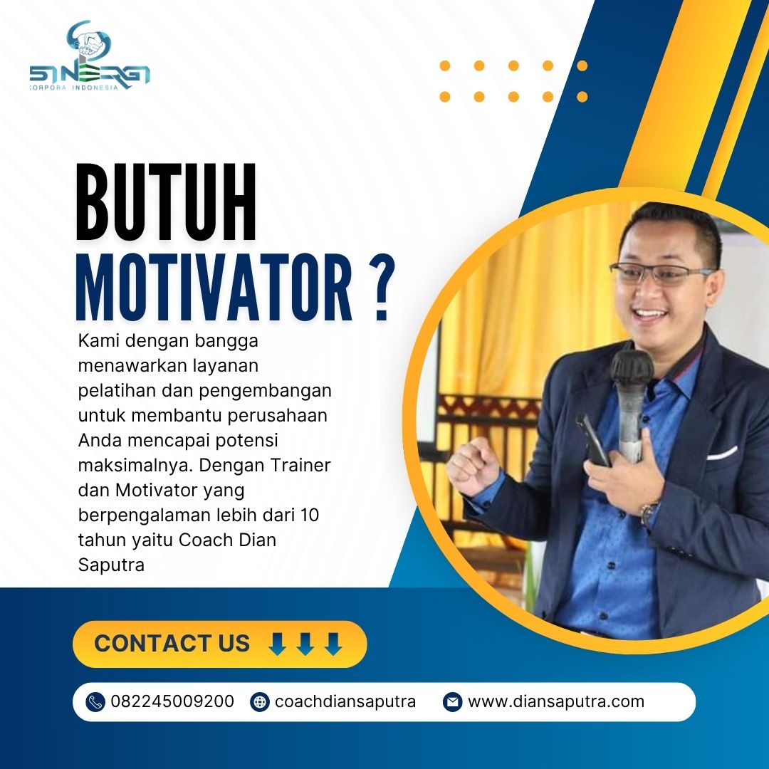 Anda Berada di Info Yang Tepat. Dian Saputra adalah seorang Motivator sekaligus Trainer sinergi corpora Indonesia yang sudah berpengalaman selama 13 Tahun. Coach Dian Saputra selalu memberikan materi yang fun dan Berdampak guna meningkatkan kinerja dan produktivitas SDM di Bisnis Anda. Coach Dian Saputra dikenal oleh Kalangan Corporate Seperti BUMN, Dinas Pemerintah, Kementerian, Hingga Corporate Swasta Lainnya berskala Nasional dan Internasional.