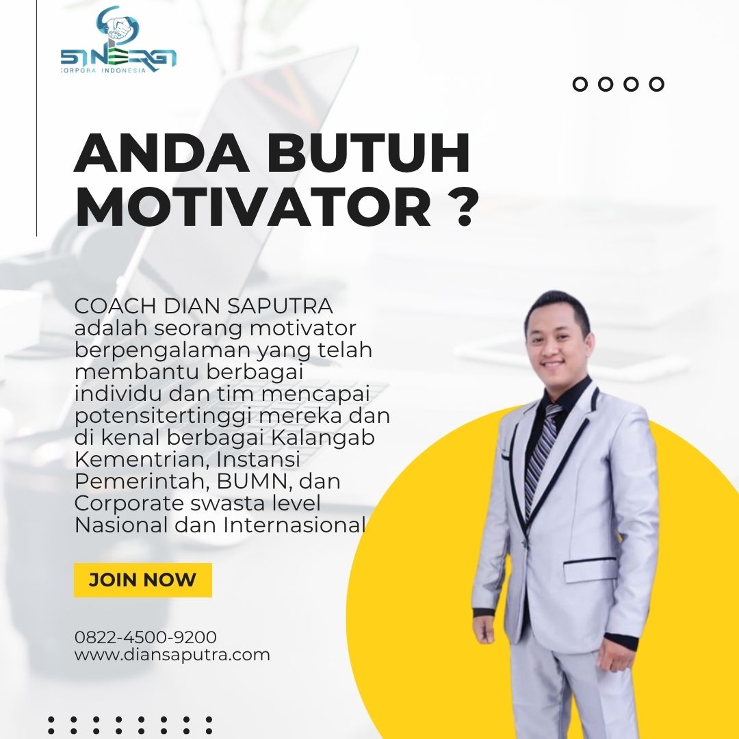 Anda Berada di Info Yang Tepat. Dian Saputra adalah seorang Motivator sekaligus Trainer sinergi corpora Indonesia yang sudah berpengalaman selama 13 Tahun. Coach Dian Saputra selalu memberikan materi yang fun dan Berdampak guna meningkatkan kinerja dan produktivitas SDM di Bisnis Anda. Coach Dian Saputra dikenal oleh Kalangan Corporate Seperti BUMN, Dinas Pemerintah, Kementerian, Hingga Corporate Swasta Lainnya berskala Nasional dan Internasional.