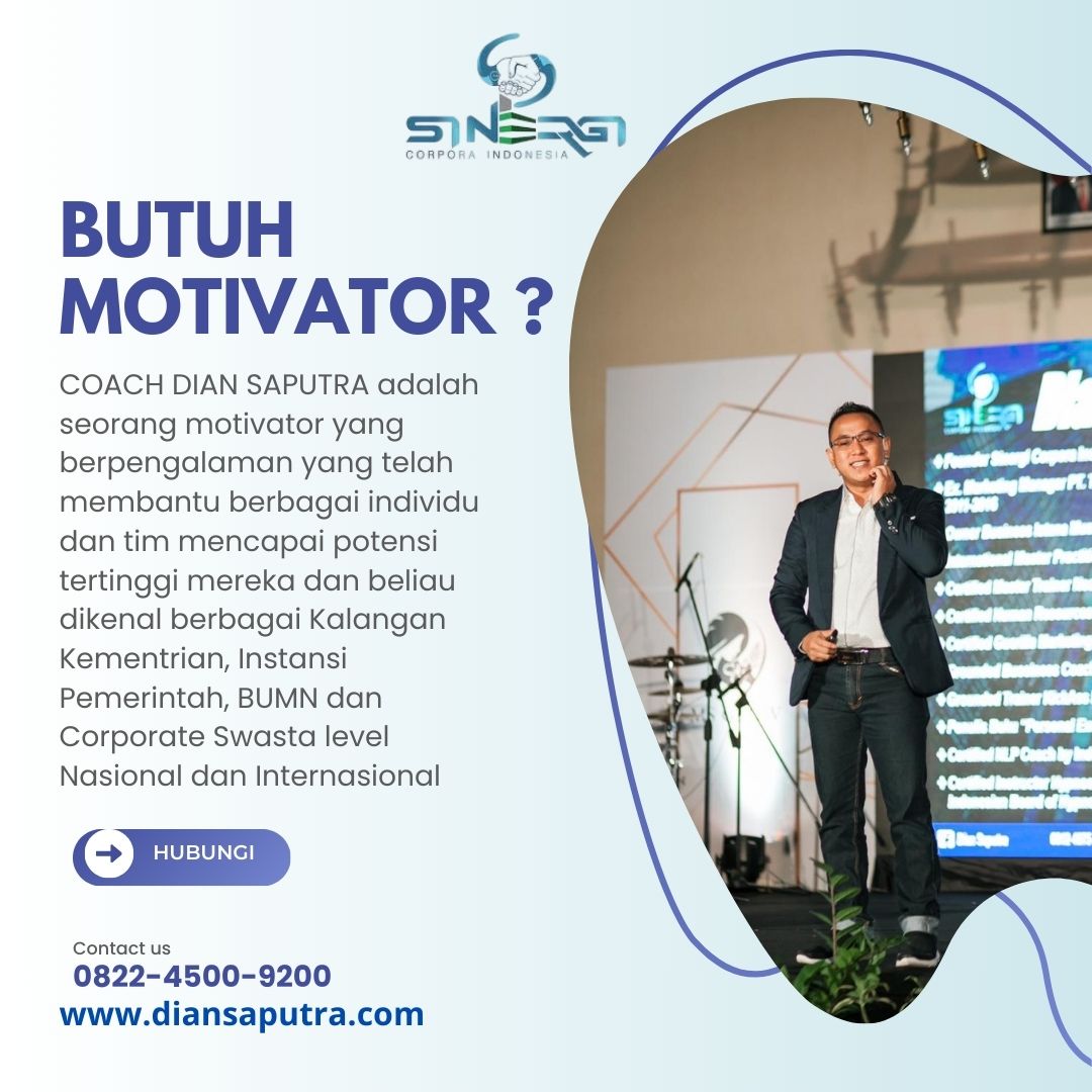 Anda Berada di Info Yang Tepat. Dian Saputra adalah seorang Motivator sekaligus Trainer sinergi corpora Indonesia yang sudah berpengalaman selama 13 Tahun. Coach Dian Saputra selalu memberikan materi yang fun dan Berdampak guna meningkatkan kinerja dan produktivitas SDM di Bisnis Anda. Coach Dian Saputra dikenal oleh Kalangan Corporate Seperti BUMN, Dinas Pemerintah, Kementerian, Hingga Corporate Swasta Lainnya berskala Nasional dan Internasional.