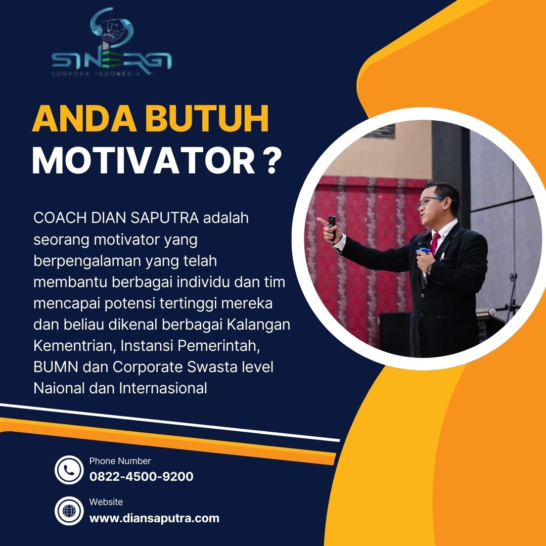 Anda Berada di Info Yang Tepat. Dian Saputra adalah seorang Motivator sekaligus Trainer sinergi corpora Indonesia yang sudah berpengalaman selama 13 Tahun. Coach Dian Saputra selalu memberikan materi yang fun dan Berdampak guna meningkatkan kinerja dan produktivitas SDM di Bisnis Anda. Coach Dian Saputra dikenal oleh Kalangan Corporate Seperti BUMN, Dinas Pemerintah, Kementerian, Hingga Corporate Swasta Lainnya berskala Nasional dan Internasional.