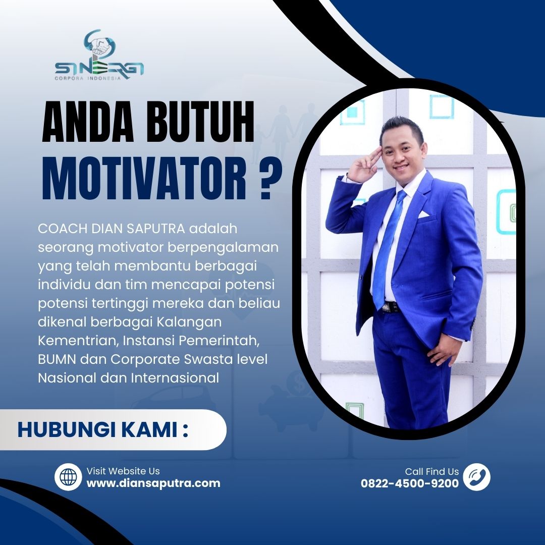 Anda Berada di Info Yang Tepat. Dian Saputra adalah seorang Motivator sekaligus Trainer sinergi corpora Indonesia yang sudah berpengalaman selama 13 Tahun. Coach Dian Saputra selalu memberikan materi yang fun dan Berdampak guna meningkatkan kinerja dan produktivitas SDM di Bisnis Anda. Coach Dian Saputra dikenal oleh Kalangan Corporate Seperti BUMN, Dinas Pemerintah, Kementerian, Hingga Corporate Swasta Lainnya berskala Nasional dan Internasional.