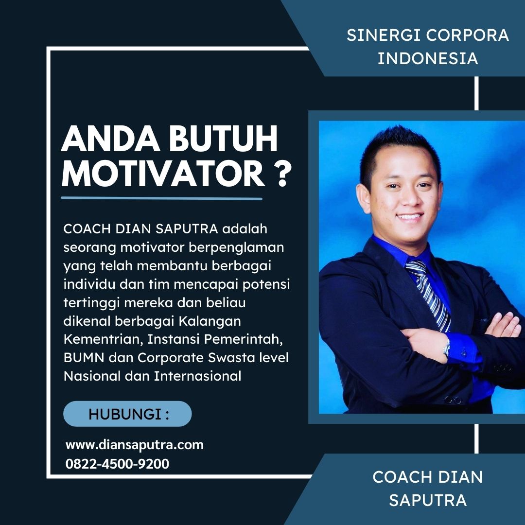 Anda Berada di Info Yang Tepat. Dian Saputra adalah seorang Motivator sekaligus Trainer sinergi corpora Indonesia yang sudah berpengalaman selama 13 Tahun. Coach Dian Saputra selalu memberikan materi yang fun dan Berdampak guna meningkatkan kinerja dan produktivitas SDM di Bisnis Anda. Coach Dian Saputra dikenal oleh Kalangan Corporate Seperti BUMN, Dinas Pemerintah, Kementerian, Hingga Corporate Swasta Lainnya berskala Nasional dan Internasional.