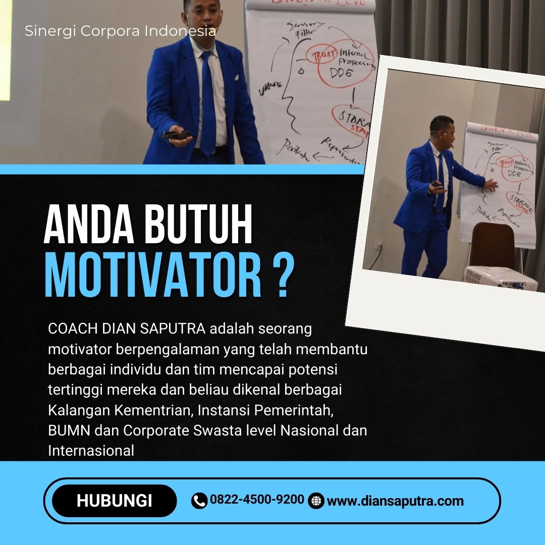 Anda Berada di Info Yang Tepat. Dian Saputra adalah seorang Motivator sekaligus Trainer sinergi corpora Indonesia yang sudah berpengalaman selama 13 Tahun. Coach Dian Saputra selalu memberikan materi yang fun dan Berdampak guna meningkatkan kinerja dan produktivitas SDM di Bisnis Anda. Coach Dian Saputra dikenal oleh Kalangan Corporate Seperti BUMN, Dinas Pemerintah, Kementerian, Hingga Corporate Swasta Lainnya berskala Nasional dan Internasional.