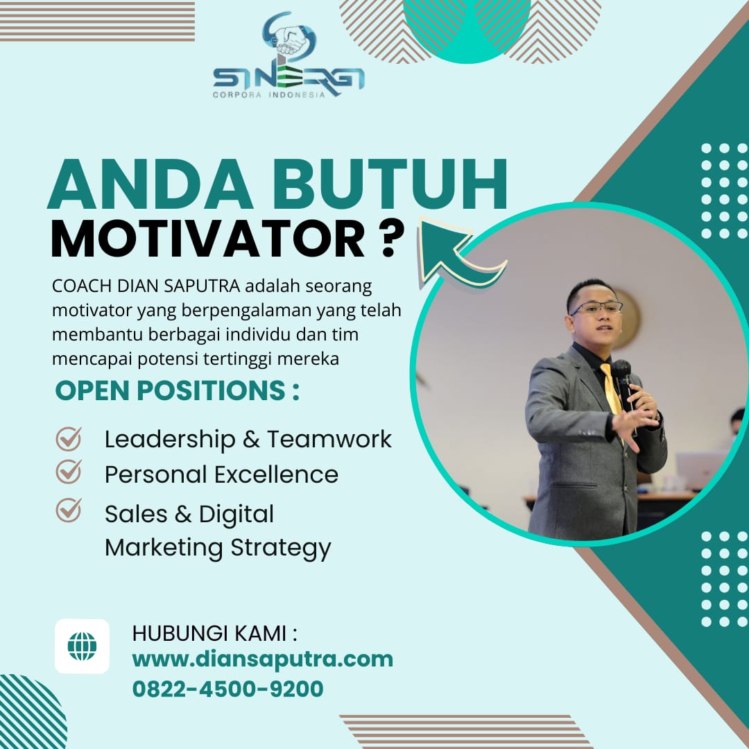 Anda Berada di Info Yang Tepat. Dian Saputra adalah seorang Motivator sekaligus Trainer sinergi corpora Indonesia yang sudah berpengalaman selama 13 Tahun. Coach Dian Saputra selalu memberikan materi yang fun dan Berdampak guna meningkatkan kinerja dan produktivitas SDM di Bisnis Anda. Coach Dian Saputra dikenal oleh Kalangan Corporate Seperti BUMN, Dinas Pemerintah, Kementerian, Hingga Corporate Swasta Lainnya berskala Nasional dan Internasional.