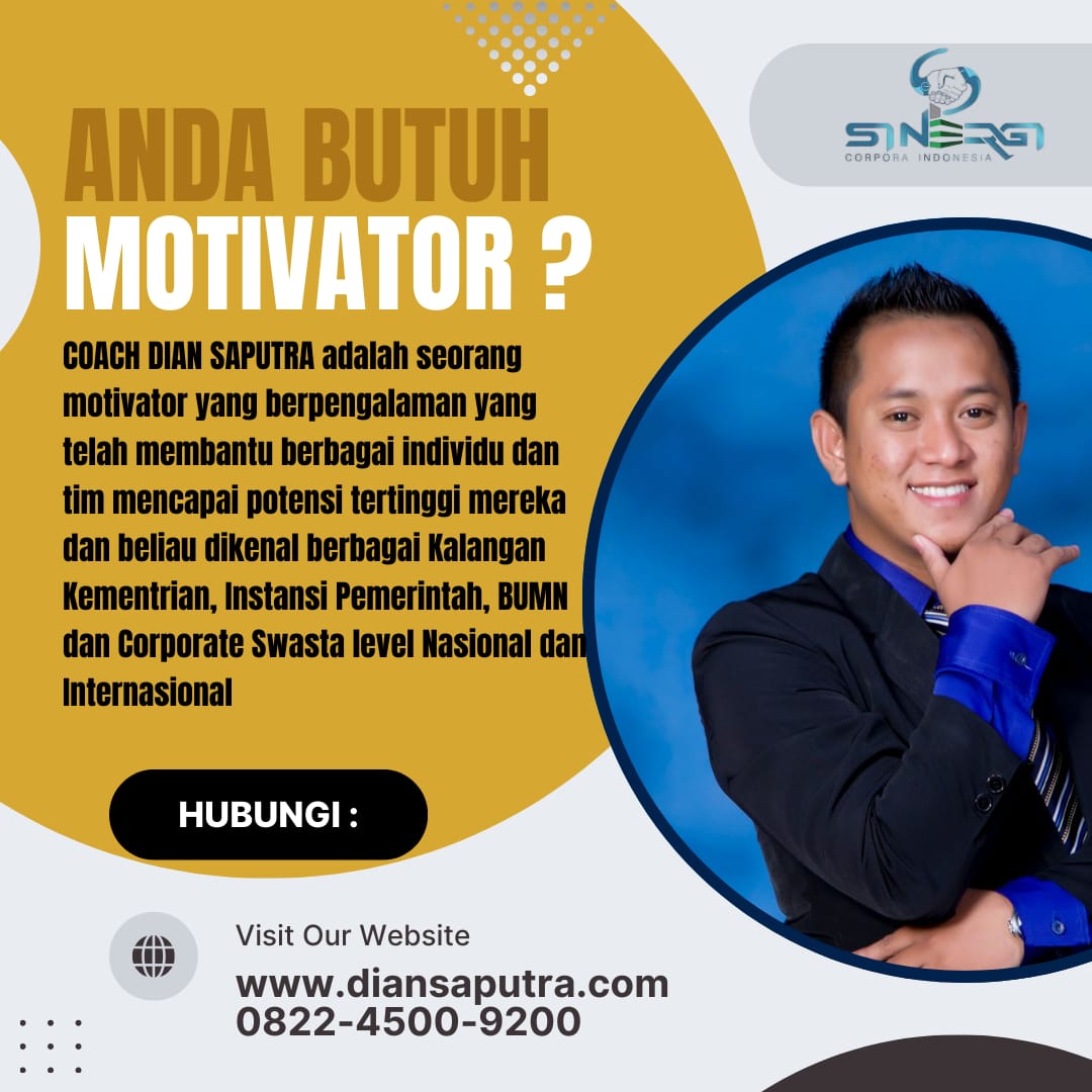 Anda Berada di Info Yang Tepat. Dian Saputra adalah seorang Motivator sekaligus Trainer sinergi corpora Indonesia yang sudah berpengalaman selama 13 Tahun. Coach Dian Saputra selalu memberikan materi yang fun dan Berdampak guna meningkatkan kinerja dan produktivitas SDM di Bisnis Anda. Coach Dian Saputra dikenal oleh Kalangan Corporate Seperti BUMN, Dinas Pemerintah, Kementerian, Hingga Corporate Swasta Lainnya berskala Nasional dan Internasional.