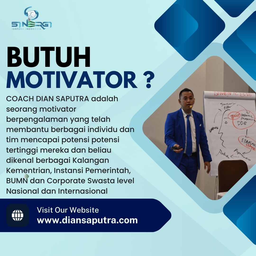 Anda Berada di Info Yang Tepat. Dian Saputra adalah seorang Motivator sekaligus Trainer sinergi corpora Indonesia yang sudah berpengalaman selama 13 Tahun. Coach Dian Saputra selalu memberikan materi yang fun dan Berdampak guna meningkatkan kinerja dan produktivitas SDM di Bisnis Anda. Coach Dian Saputra dikenal oleh Kalangan Corporate Seperti BUMN, Dinas Pemerintah, Kementerian, Hingga Corporate Swasta Lainnya berskala Nasional dan Internasional.
