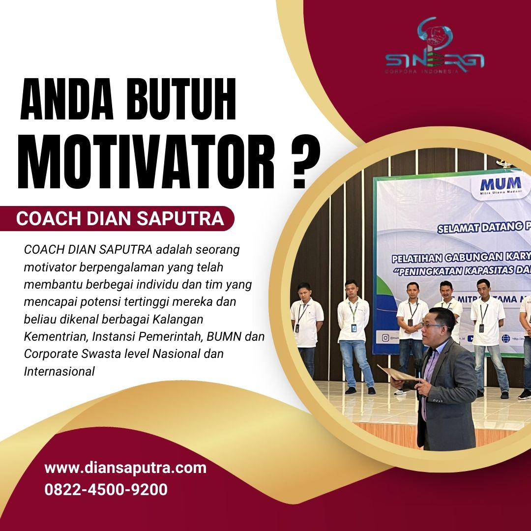 Anda Berada di Info Yang Tepat. Dian Saputra adalah seorang Motivator sekaligus Trainer sinergi corpora Indonesia yang sudah berpengalaman selama 13 Tahun. Coach Dian Saputra selalu memberikan materi yang fun dan Berdampak guna meningkatkan kinerja dan produktivitas SDM di Bisnis Anda. Coach Dian Saputra dikenal oleh Kalangan Corporate Seperti BUMN, Dinas Pemerintah, Kementerian, Hingga Corporate Swasta Lainnya berskala Nasional dan Internasional.
