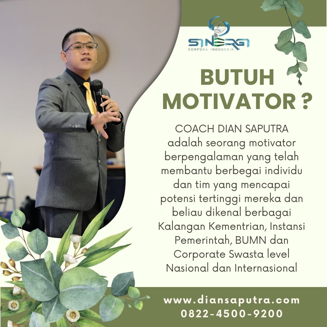 Anda Berada di Info Yang Tepat. Dian Saputra adalah seorang Motivator sekaligus Trainer sinergi corpora Indonesia yang sudah berpengalaman selama 13 Tahun. Coach Dian Saputra selalu memberikan materi yang fun dan Berdampak guna meningkatkan kinerja dan produktivitas SDM di Bisnis Anda. Coach Dian Saputra dikenal oleh Kalangan Corporate Seperti BUMN, Dinas Pemerintah, Kementerian, Hingga Corporate Swasta Lainnya berskala Nasional dan Internasional.