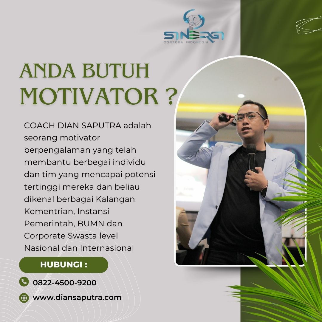 Anda Berada di Info Yang Tepat. Dian Saputra adalah seorang Motivator sekaligus Trainer sinergi corpora Indonesia yang sudah berpengalaman selama 13 Tahun. Coach Dian Saputra selalu memberikan materi yang fun dan Berdampak guna meningkatkan kinerja dan produktivitas SDM di Bisnis Anda. Coach Dian Saputra dikenal oleh Kalangan Corporate Seperti BUMN, Dinas Pemerintah, Kementerian, Hingga Corporate Swasta Lainnya berskala Nasional dan Internasional.