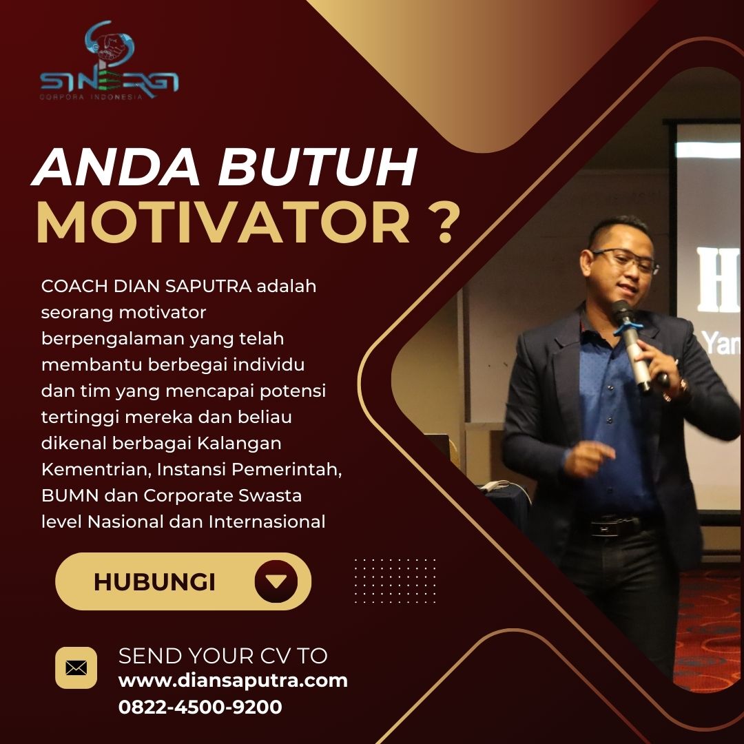Anda Berada di Info Yang Tepat. Dian Saputra adalah seorang Motivator sekaligus Trainer sinergi corpora Indonesia yang sudah berpengalaman selama 13 Tahun. Coach Dian Saputra selalu memberikan materi yang fun dan Berdampak guna meningkatkan kinerja dan produktivitas SDM di Bisnis Anda. Coach Dian Saputra dikenal oleh Kalangan Corporate Seperti BUMN, Dinas Pemerintah, Kementerian, Hingga Corporate Swasta Lainnya berskala Nasional dan Internasional.