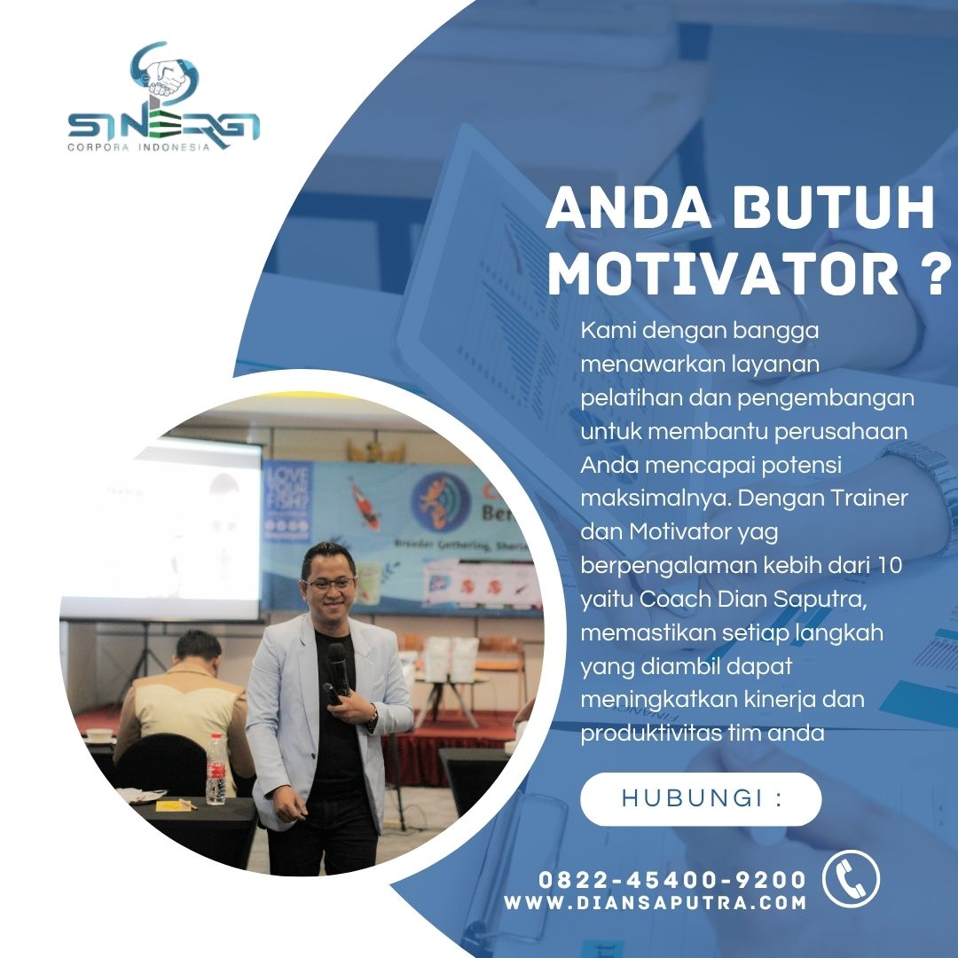 Anda Berada di Info Yang Tepat. Dian Saputra adalah seorang Motivator sekaligus Trainer sinergi corpora Indonesia yang sudah berpengalaman selama 13 Tahun. Coach Dian Saputra selalu memberikan materi yang fun dan Berdampak guna meningkatkan kinerja dan produktivitas SDM di Bisnis Anda. Coach Dian Saputra dikenal oleh Kalangan Corporate Seperti BUMN, Dinas Pemerintah, Kementerian, Hingga Corporate Swasta Lainnya berskala Nasional dan Internasional.