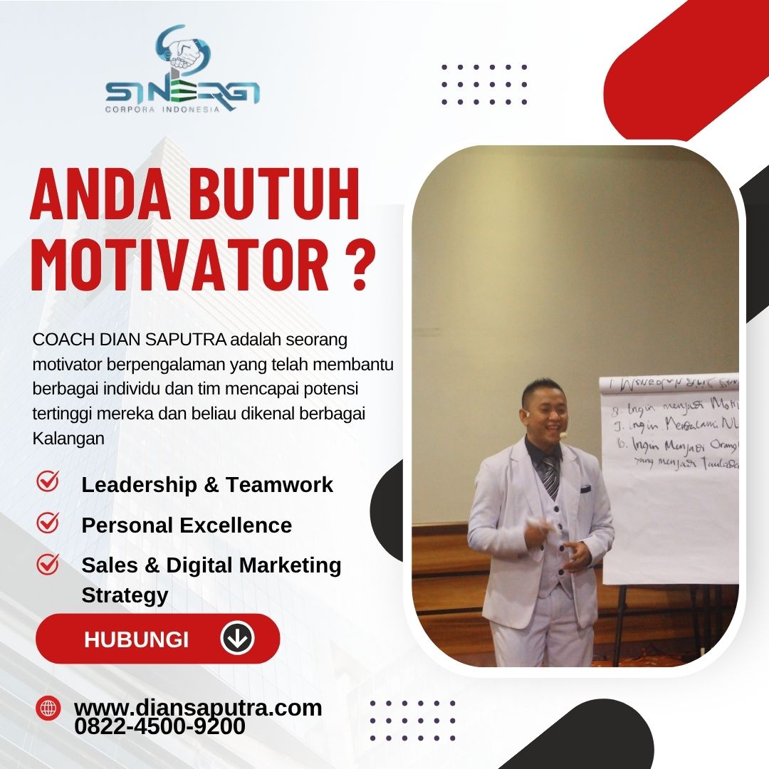 Anda Berada di Info Yang Tepat. Dian Saputra adalah seorang Motivator sekaligus Trainer sinergi corpora Indonesia yang sudah berpengalaman selama 13 Tahun. Coach Dian Saputra selalu memberikan materi yang fun dan Berdampak guna meningkatkan kinerja dan produktivitas SDM di Bisnis Anda. Coach Dian Saputra dikenal oleh Kalangan Corporate Seperti BUMN, Dinas Pemerintah, Kementerian, Hingga Corporate Swasta Lainnya berskala Nasional dan Internasional.